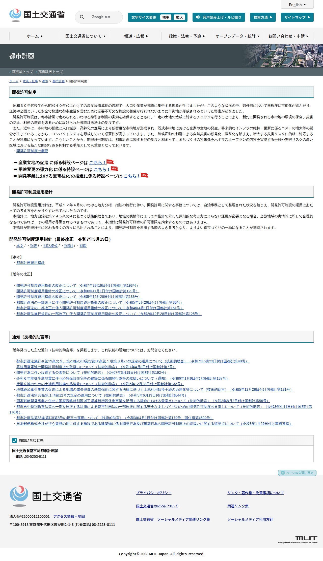 このページは、国土交通省が提供する都市計画における開発許可制度についての説明です。同制度は、高度経済成長期の無秩序な市街化を防ぎ、安全で快適な都市環境を確保するために昭和30年代に設けられました。線引き制度の実効性確保と土地造成のチェックを通じて、環境保全と災害防止を図ります。近年は人口減少・高齢化に対応するコンパクトシティの形成と、増加する災害リスクへの対応が重要とされています。開発許可制度運用指針や技術的助言など関連資料が掲載されています。