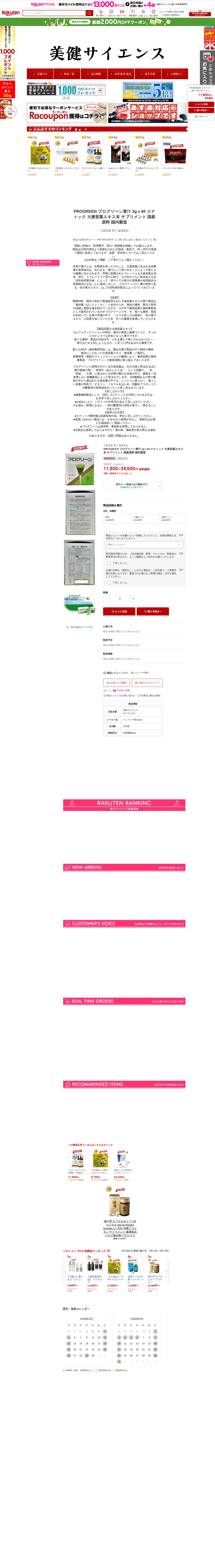 このページは、楽天市場で販売されているPROGREEN(プログリーン)青汁の商品ページです。3g×60スティックの大麦若葉エキス末サプリメントで、国産原料・国内製造品です。価格は11,800円から34,600円で送料無料。大分県産の希少品種「赤神力」を農薬不使用で有機栽培し、収穫当日に粉末化する「活性保存製法」により生の青汁エキスの栄養を長期保存。ビタミン、ミネラル、フラボノイド、酵素などを含む健康食品として、水や好みの飲料に混ぜて1~2スティック摂取します。