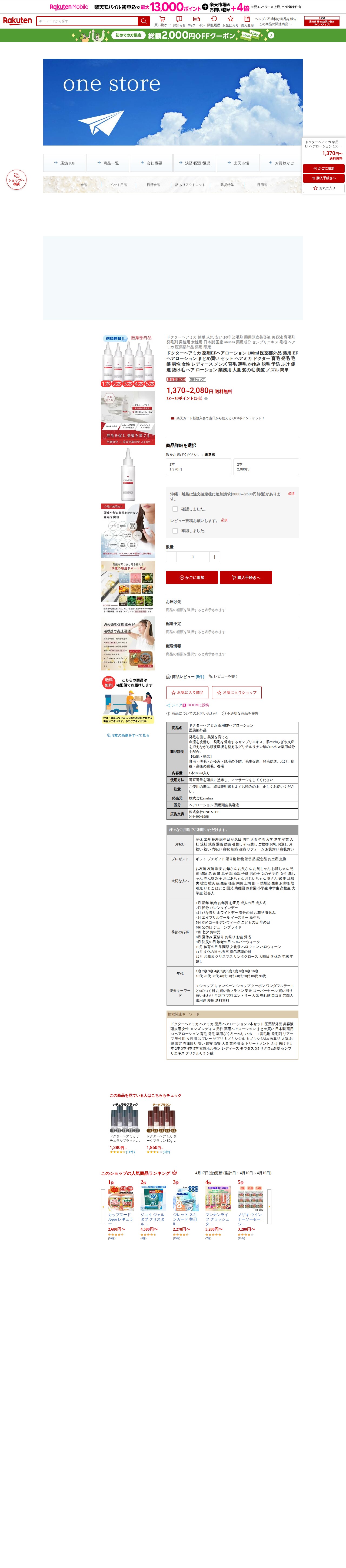 このページは、楽天市場で販売されているドクターヘアミカ薬用EFヘアローション100mlの商品ページです。医薬部外品として、センブリエキスとグリチルリチン酸2Kの2つの薬用成分を配合しており、育毛促進、薄毛予防、かゆみ軽減、脱毛予防などの効果が期待できます。1本1,370円から2本セット2,080円で購入でき、送料無料です。男女問わず使用でき、頭皮にマッサージしながら塗布する使用方法となっています。株式会社anuhea発売、ONE STEPが販売しています。