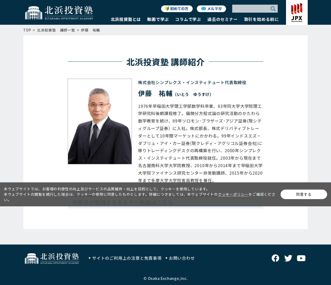 このページは、北浜投資塾の講師である伊藤祐輔氏の紹介ページです。伊藤氏は株式会社シンプレクス・インスティテュート代表取締役で、1976年早稲田大学理工学部数学科卒業、1983年同大学院修了。偏微分方程式論の研究を経て、1989年ソロモン・ブラザーズ・アジア証券に入社し、株式部長やトレーダーとして10年間マーケットに従事。その後複数の証券会社を経て2000年にシンプレクス・インスティテュート代表取締役に就任。名古屋商科大学大学院教授、早稲田大学大学院講師、多摩大学大学院客員教授を兼任した経歴を持つ投資教育の専門家です。