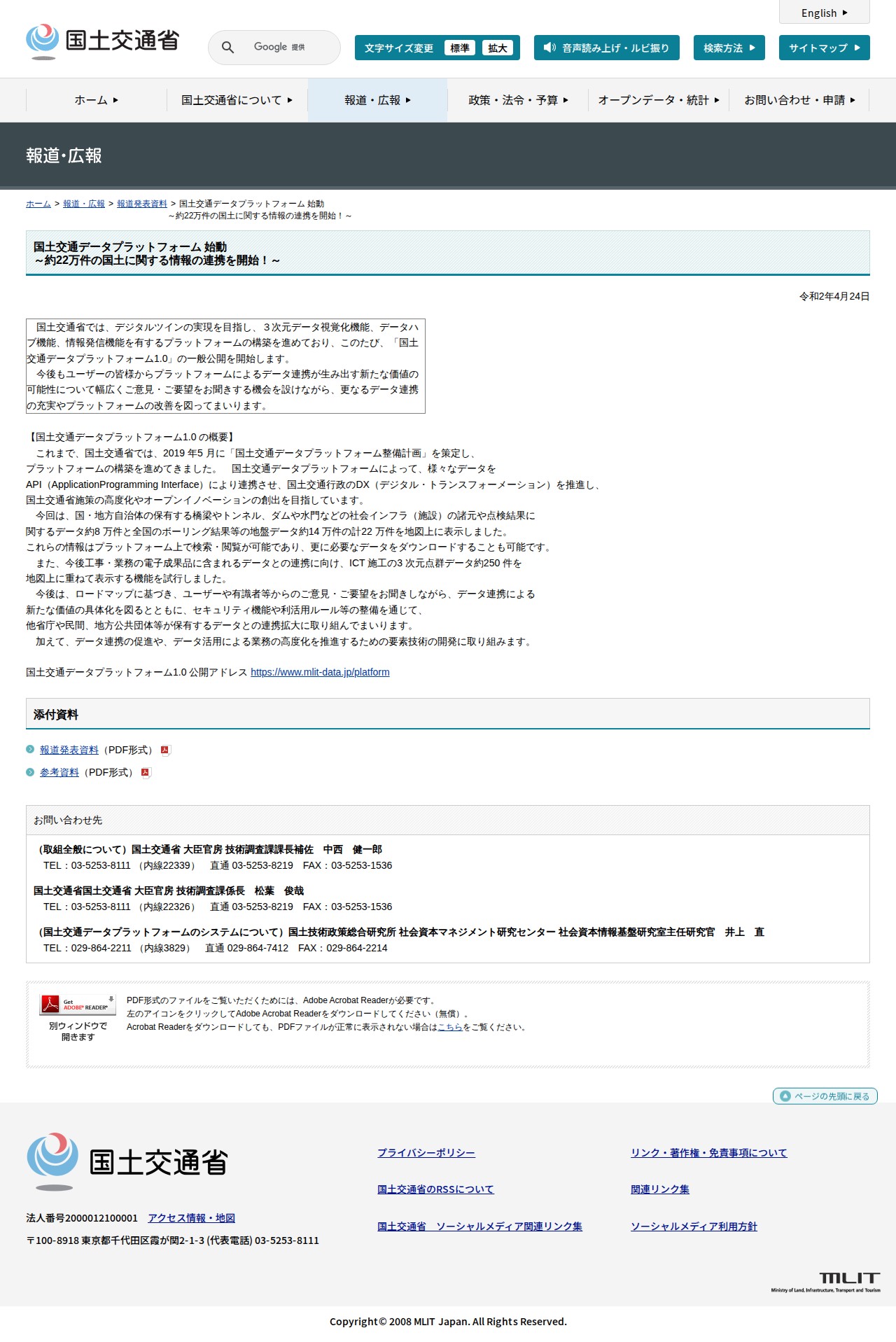 報道発表資料:国土交通データプラットフォーム 始動<br>~約22万件の国土に関する情報の連携を開始!~ - 国土交通省 - 保存されたスクリーンショット