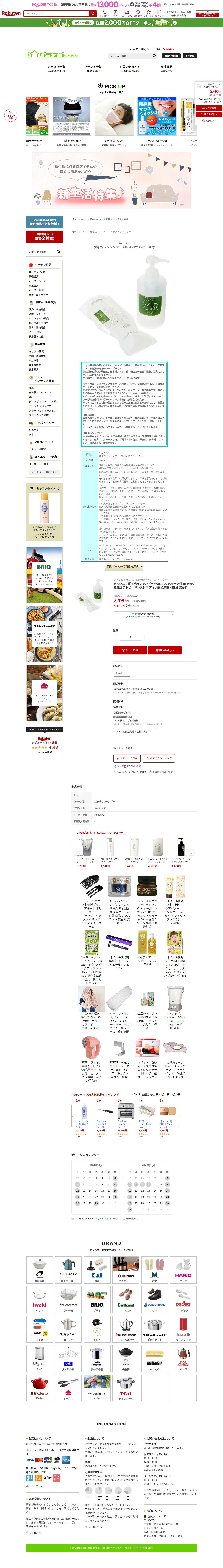 このページは、楽天市場で販売されている「あんだんて 髪を洗うシャンプー 400ml」の商品紹介ページです。天然系アミノ酸無添加処方で、敏感肌やアトピー肌向けの低刺激シャンプーです。弱酸性、無香料で、リンス不要。エアレスパウチと専用ケースのセットで、ポンプ式のため衛生的で詰め替えが簡単です。環境にも配慮した設計となっています。価格は2,490円で、送料590円です。