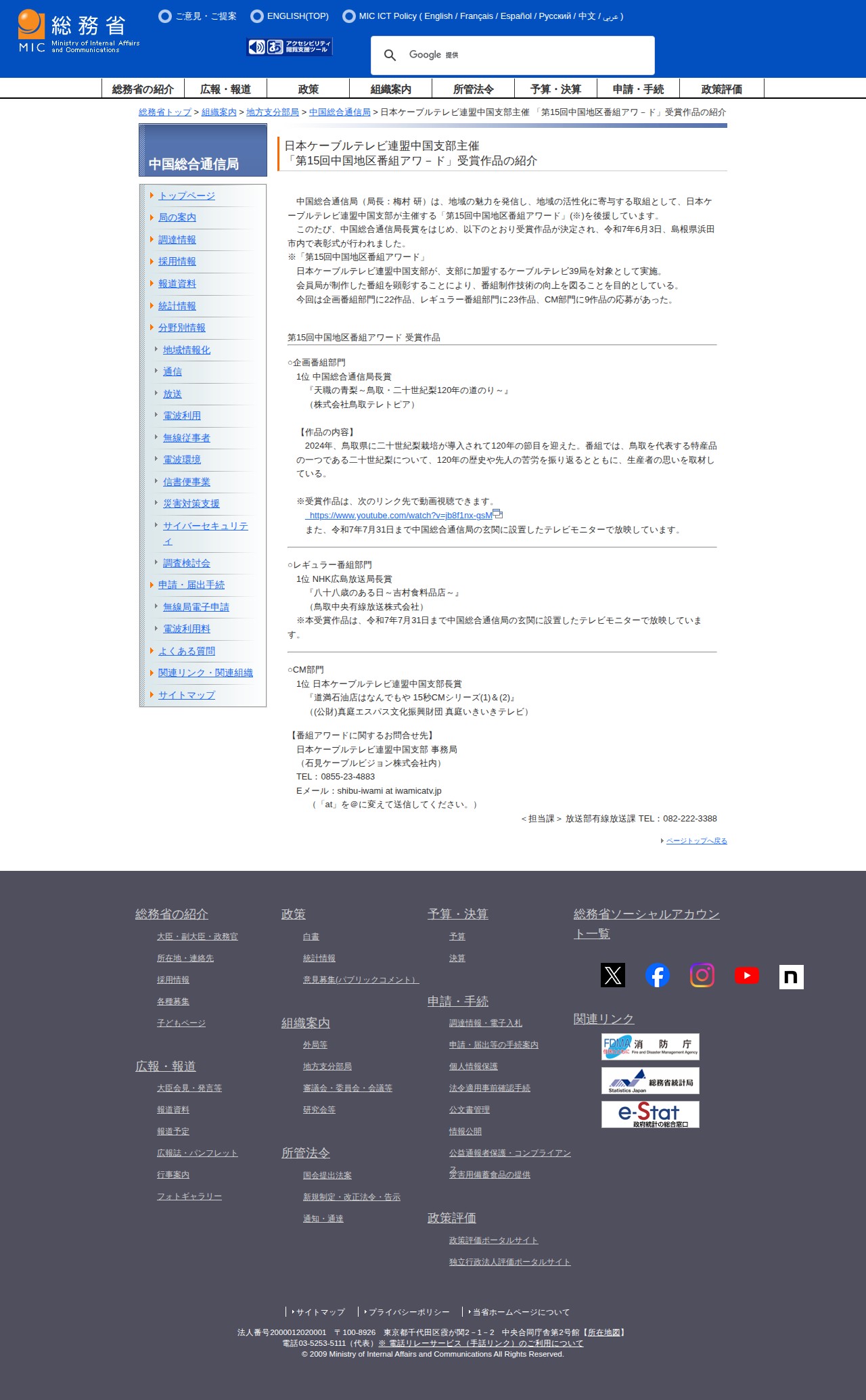 このページは、中国総合通信局が後援する「第15回中国地区番組アワード」の受賞作品を紹介しています。日本ケーブルテレビ連盟中国支部が主催し、加盟する39局の番組制作技術向上を目的とした賞です。企画番組部門22作品、レギュラー番組部門23作品、CM部門9作品の応募があり、受賞作品が決定されました。中国総合通信局長賞は『天職の青梨~鳥取・二十世紀梨120年の道のり~』で、鳥取県の特産品である二十世紀梨の120年の歴史と生産者の思いを描いています。表彰式は令和7年6月3日に島根県浜田市で開催されました。