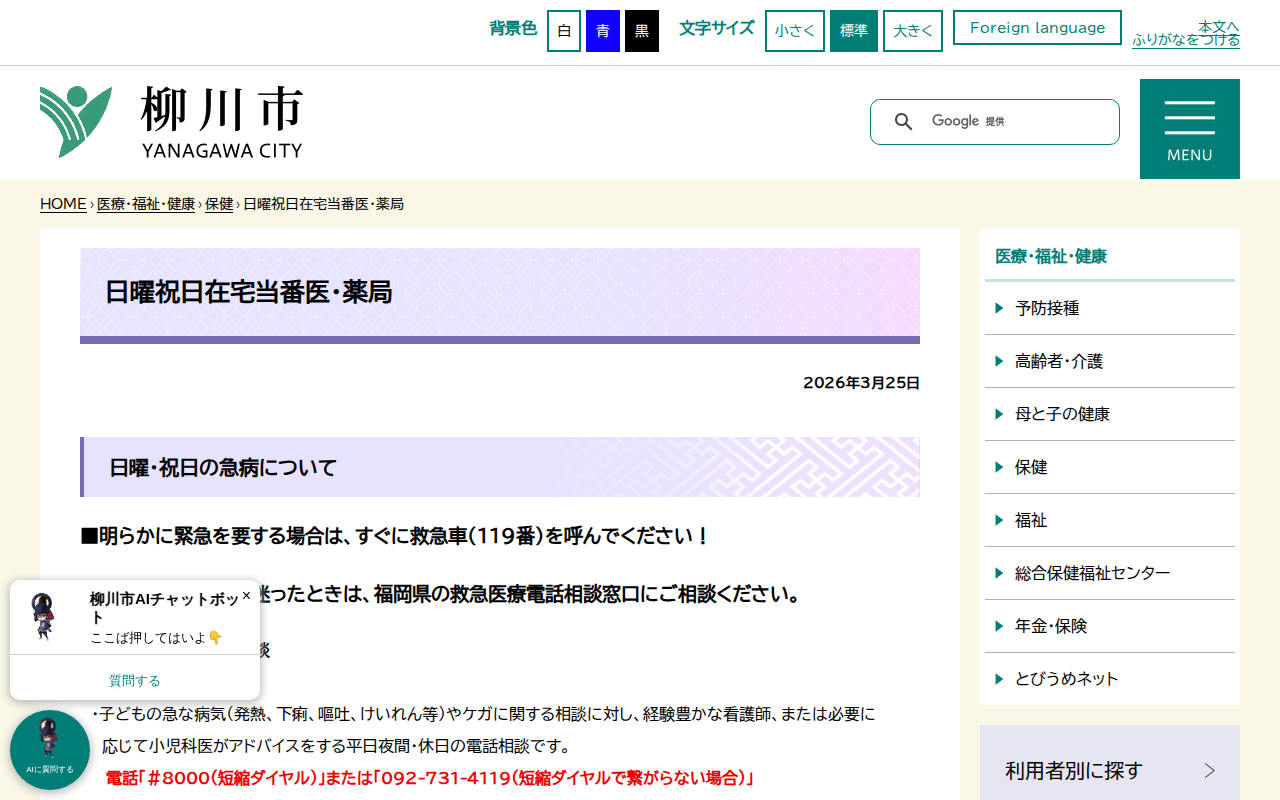 日曜祝日在宅当番医・薬局 - 柳川市
