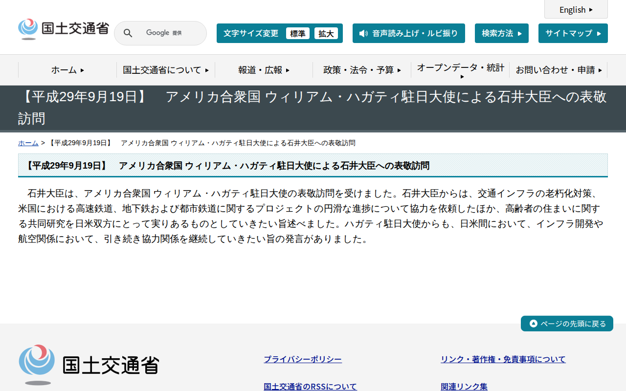 【平成29年9月19日】 アメリカ合衆国 ウィリアム・ハガティ駐日大使による石井大臣への表敬訪問 - 国土交通省
