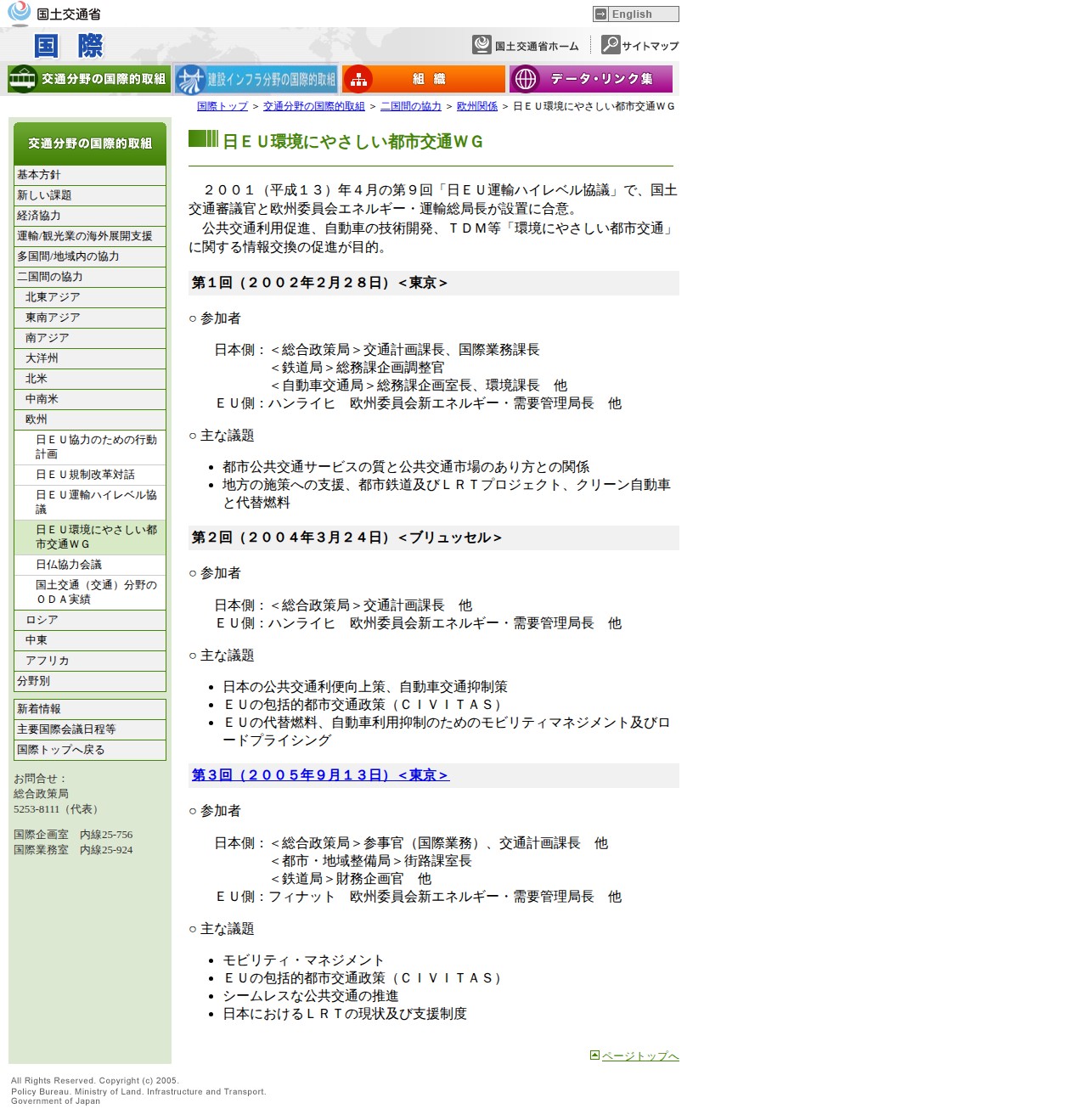 このページは、2001年4月の日EU運輸ハイレベル協議で設置された「日EU環境にやさしい都市交通ワーキンググループ」について記載しています。公共交通利用促進、自動車技術開発、TDM等の環境配慮型都市交通に関する情報交換が目的です。2002年の東京での第1回会合から2005年の第3回東京会合まで、日本とEU委員会の担当者が参加し、公共交通サービス、クリーン自動車、モビリティ・マネジメント、LRT、ロードプライシング等の議題について協議を重ねています。