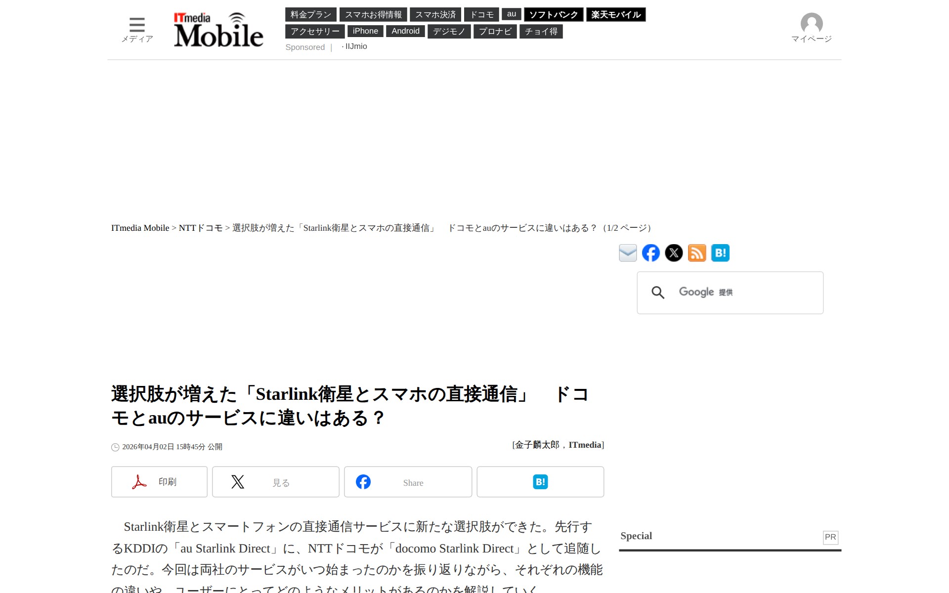 選択肢が増えた「Starlink衛星とスマホの直接通信」 ドコモとauのサービスに違いはある?(1/2 ページ) - ITmedia Mobile - 保存されたスクリーンショット