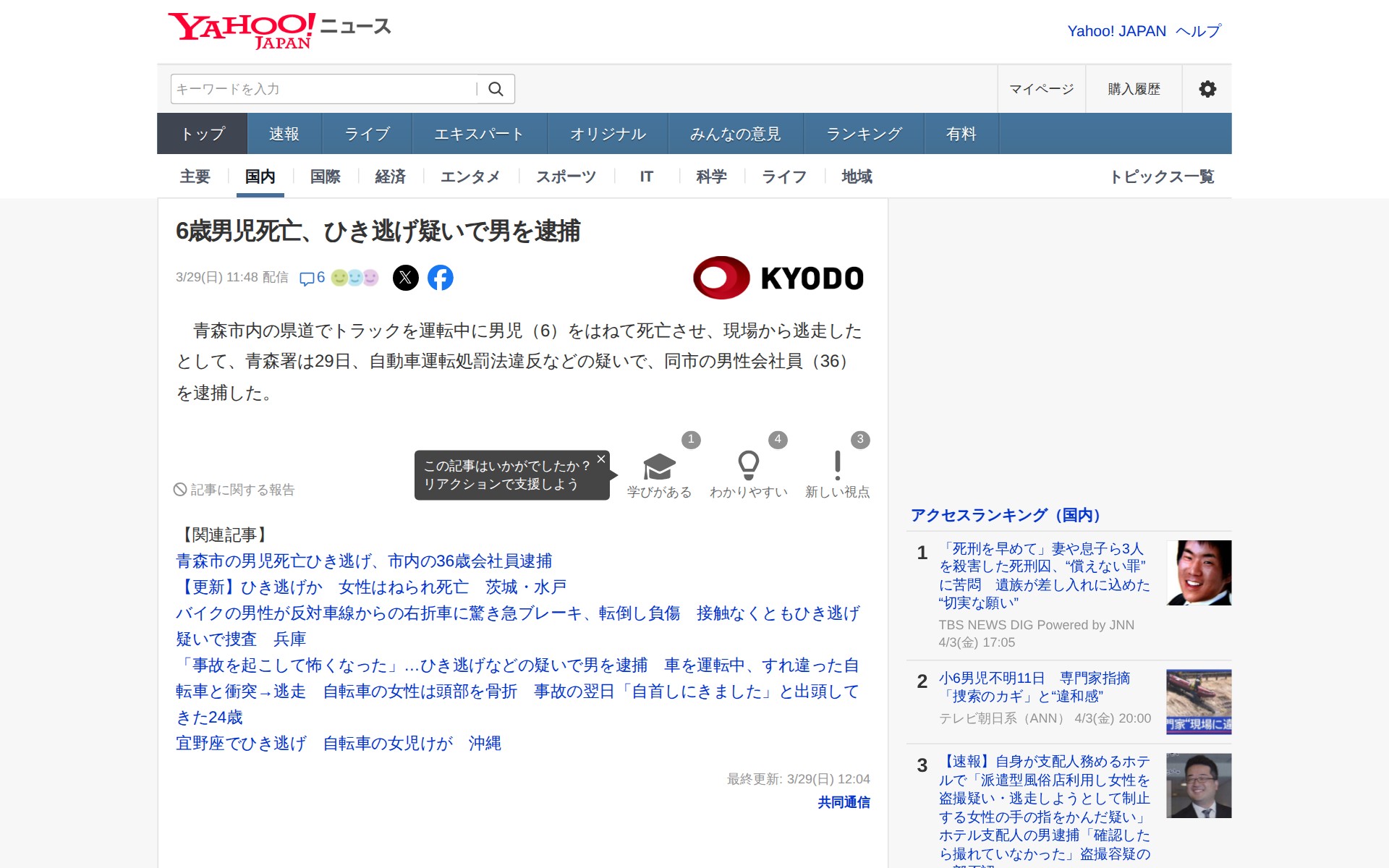 このページは、青森市の県道でトラックを運転していた36歳の男性会社員が、6歳の男児をはねて死亡させ現場から逃走したとして、自動車運転処罰法違反などの疑いで逮捕されたニュースを報じています。事件は2024年3月29日に発生し、青森署が逮捕しました。記事ではこのひき逃げ事件に関連した複数のコメントも掲載されており、ひき逃げの増加傾向と被害者救済の重要性について触れられています。