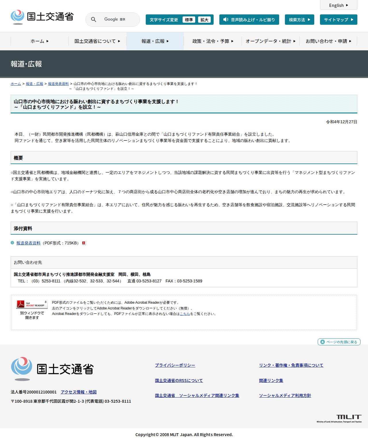 報道発表資料:山口市の中心市街地における賑わい創出に資するまちづくり事業を支援します!<br>~「山口まちづくりファンド」を設立!~ - 国土交通省 - 保存されたスクリーンショット