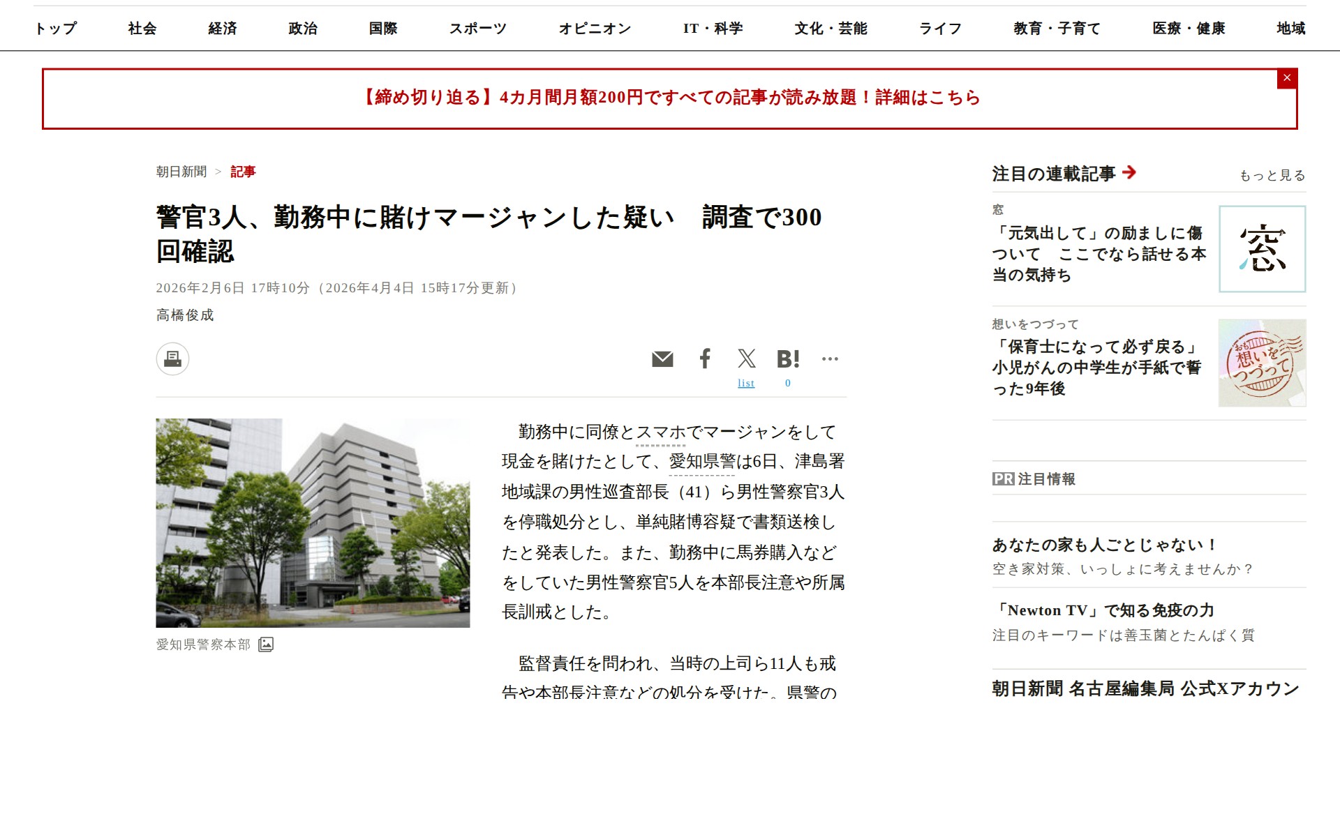 ![警官3人、勤務中に賭けマージャンした疑い 調査で300回確認 [愛知県]:朝日新聞 - 保存されたスクリーンショット](https://pub-f6fa8ca7bebe4069bff3224f9a8f5334.r2.dev