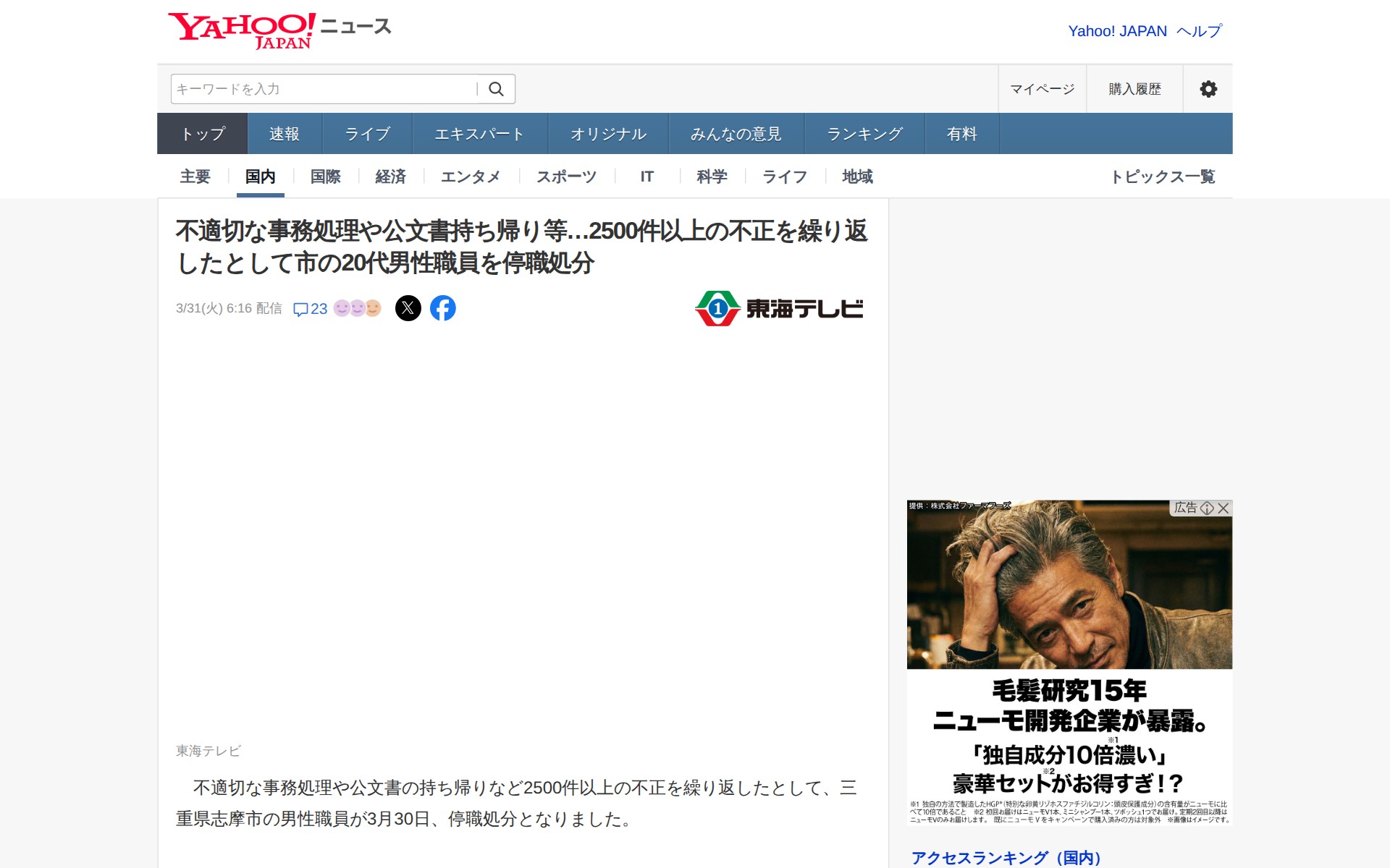 不適切な事務処理や公文書持ち帰り等…2500件以上の不正を繰り返したとして市の20代男性職員を停職処分(東海テレビ) - Yahoo!ニュース - 保存されたスクリーンショット