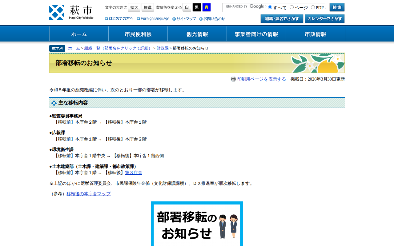 部署移転のお知らせ - 萩市ホームページ