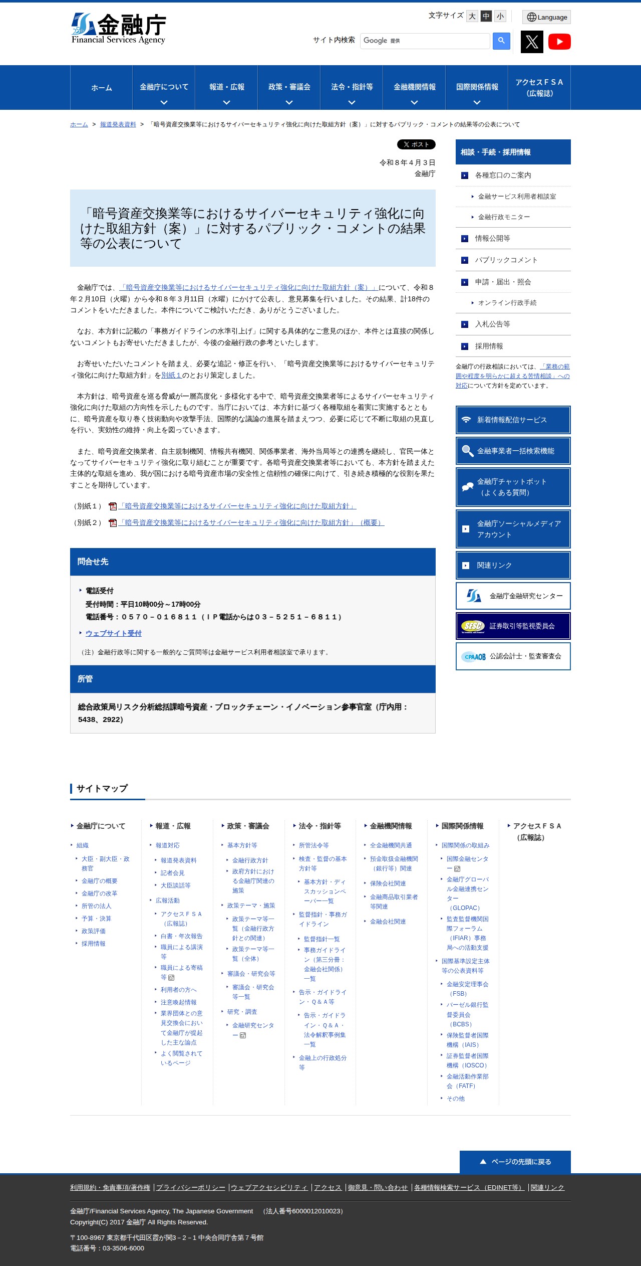 「暗号資産交換業等におけるサイバーセキュリティ強化に向けた取組方針(案)」に対するパブリック・コメントの結果等の公表について:金融庁