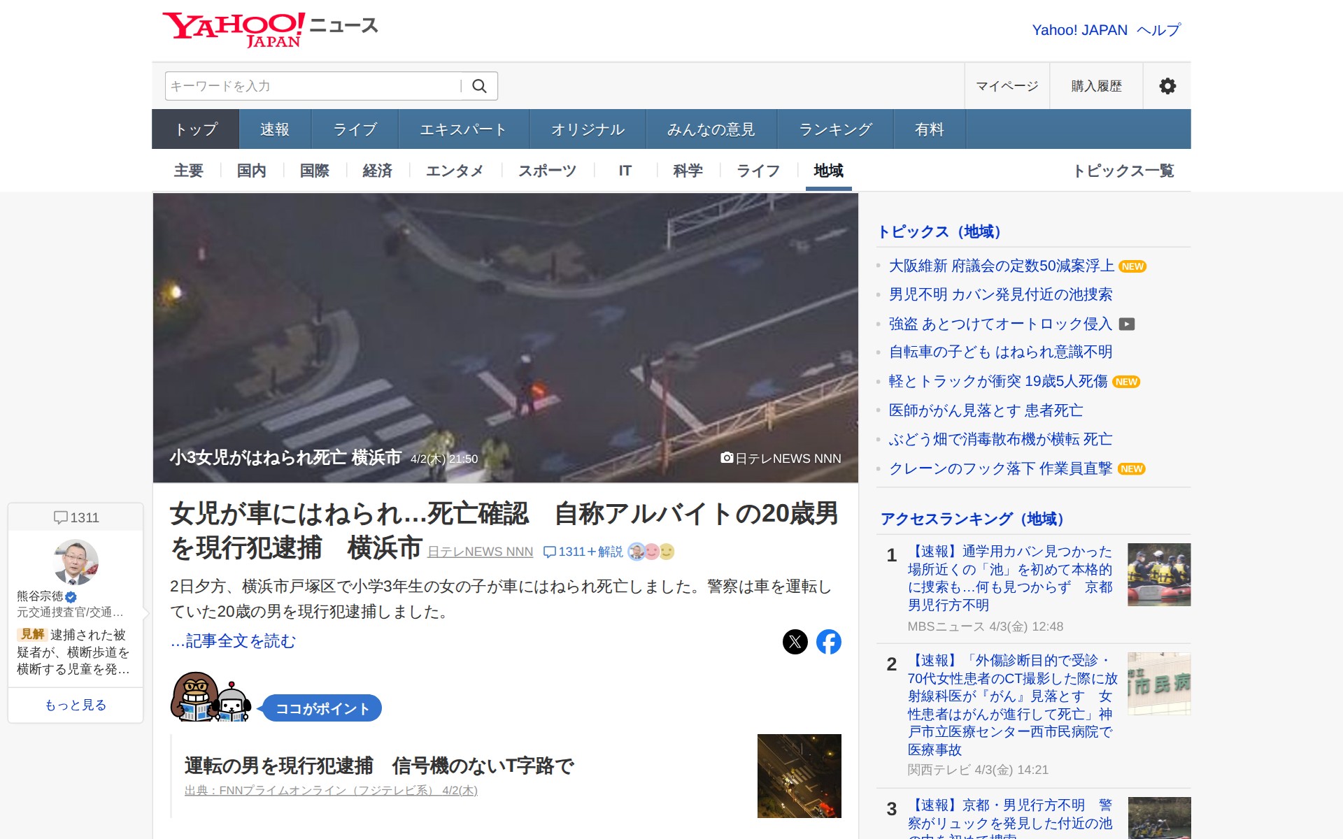 小3女児がはねられ死亡 横浜市 - Yahoo!ニュース - 保存されたスクリーンショット