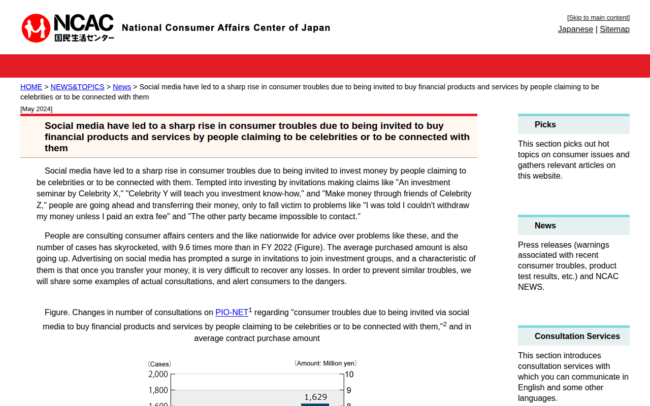 Social media have led to a sharp rise in consumer troubles due to being invited to buy financial products and services by people claiming to be celebrities or to be connected with them - National Consumer Affairs Center of JAPAN -