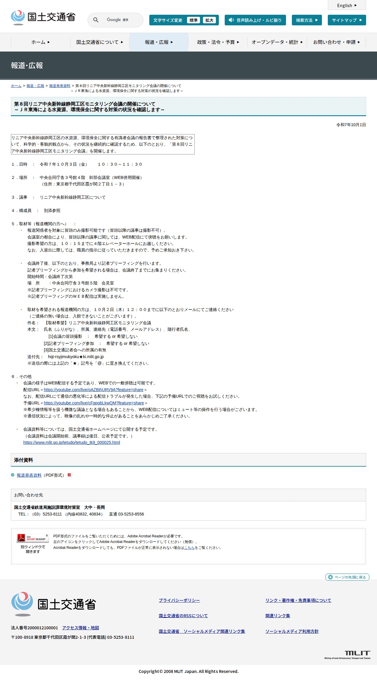 このページは、リニア中央新幹線静岡工区に関する第8回モニタリング会議の開催を告知する国土交通省の報道発表資料です。令和7年10月3日に開催される会議では、JR東海による水資源・環境保全対策の状況を科学的・客観的観点から確認します。会議は東京都千代田区の中央合同庁舎で開催され、WEB併用開催となります。報道機関向けに冒頭のみ撮影可能で、会議終了後に記者ブリーフィングが行われます。一般向けにはYouTubeでのWEB配信を予定しており、会議資料は国土交通省ホームページで公開予定です。