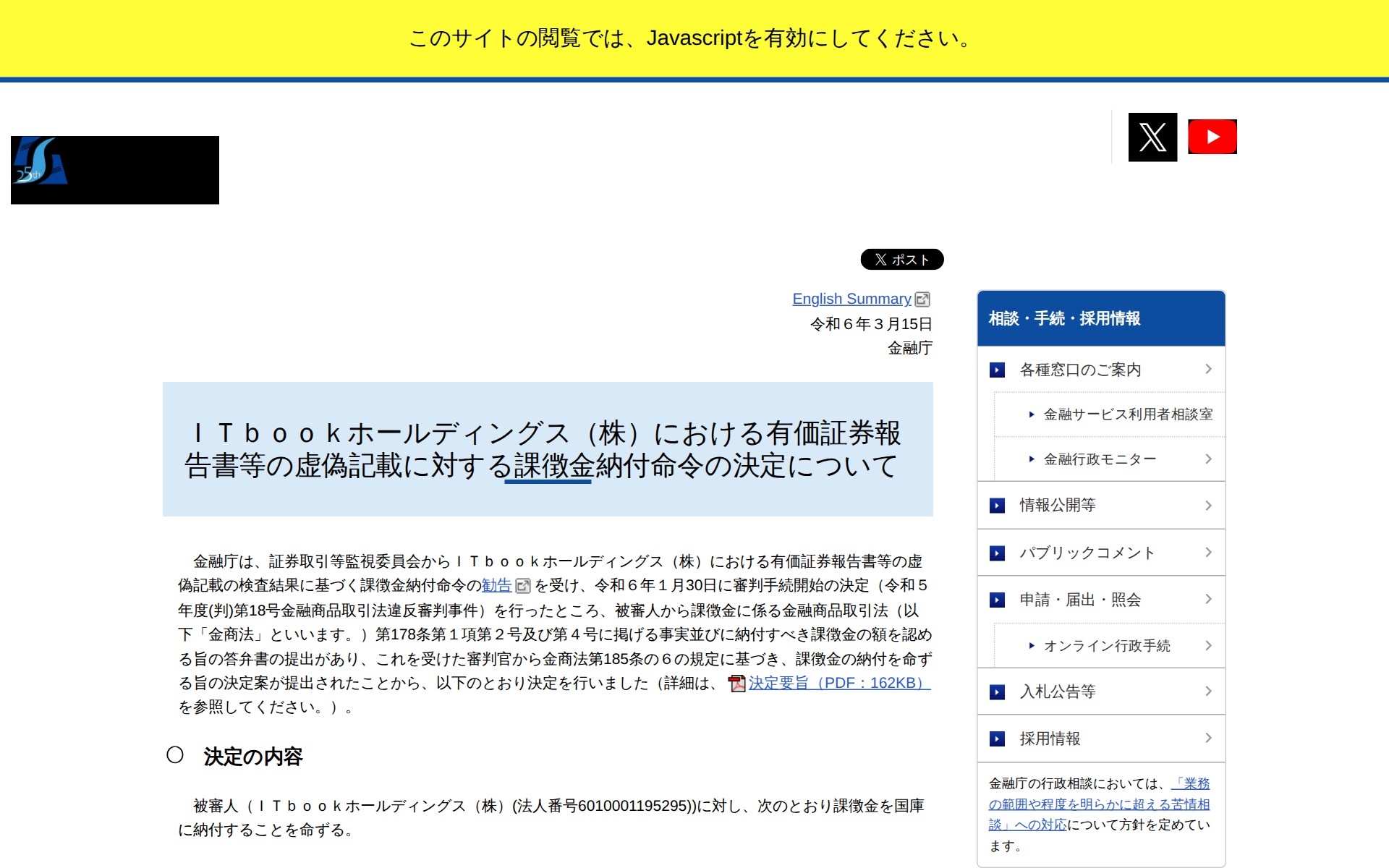 ITbookホールディングス(株)における有価証券報告書等の虚偽記載に対する課徴金納付命令の決定について:金融庁