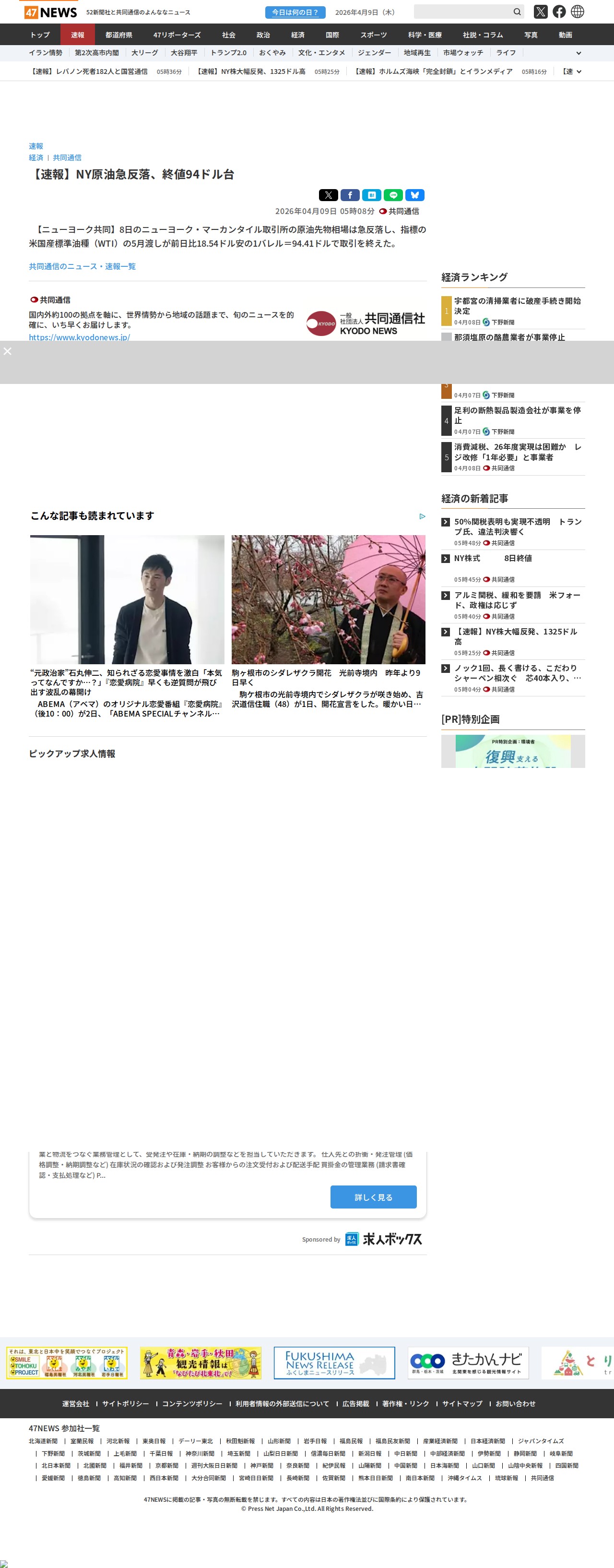 【速報】NY原油急反落、終値94ドル台|47NEWS(よんななニュース) - 保存されたスクリーンショット