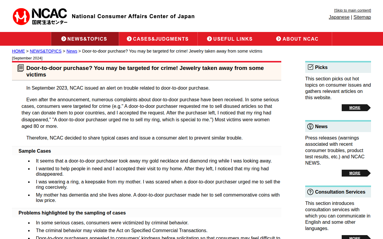 Door-to-door purchase? You may be targeted for crime! Jewelry taken away from some victims - National Consumer Affairs Center of JAPAN -