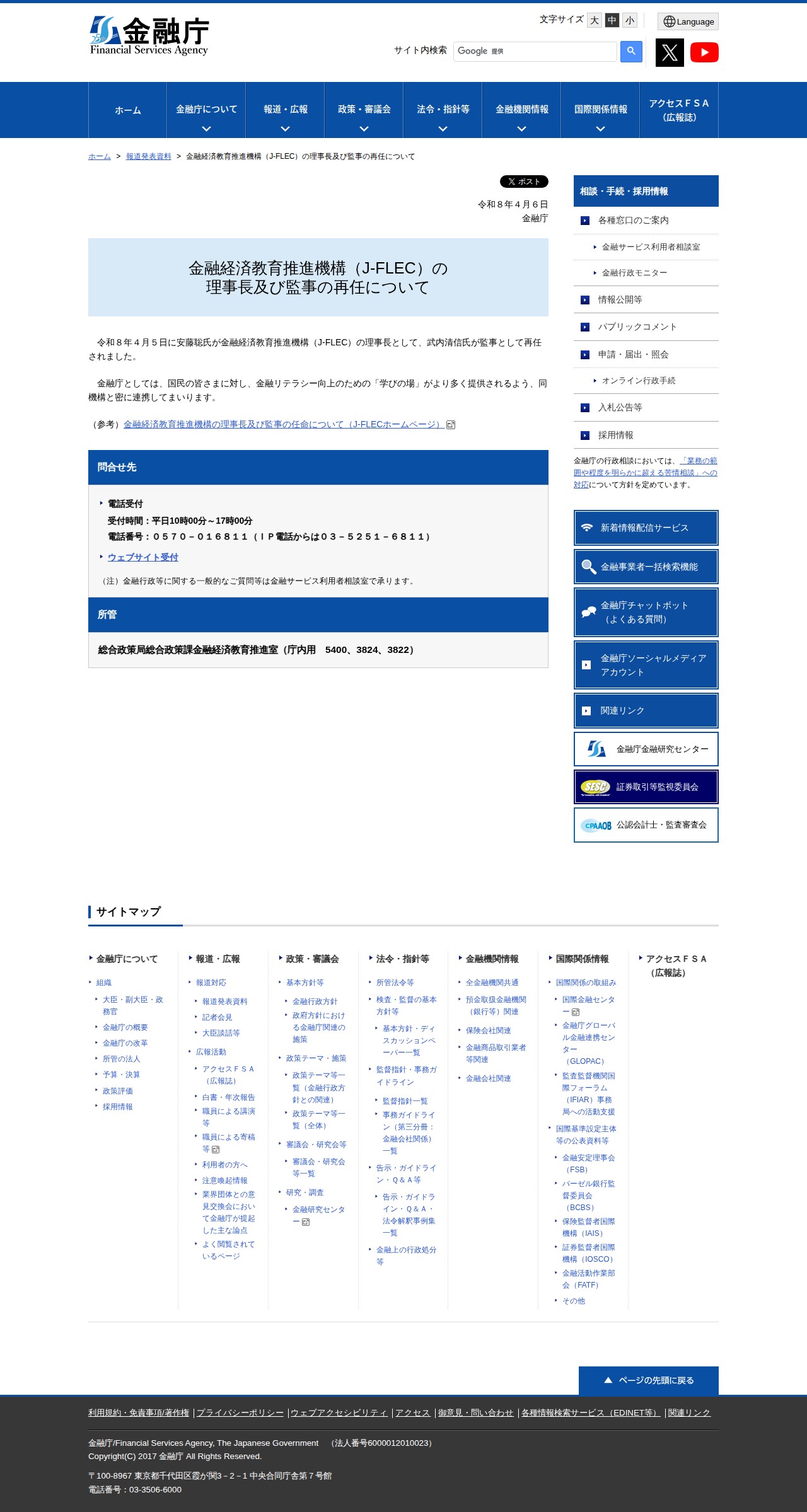 金融経済教育推進機構(J-FLEC)の理事長及び監事の再任について:金融庁 - 保存されたスクリーンショット