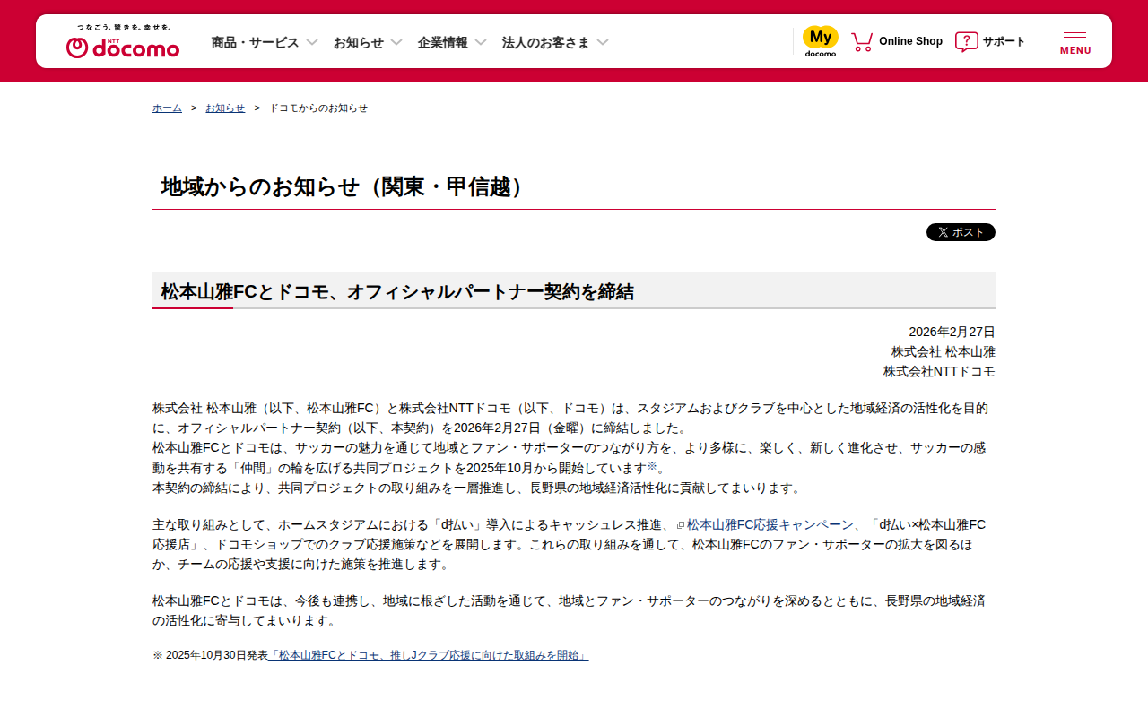 地域からのお知らせ:松本山雅FCとドコモ、オフィシャルパートナー契約を締結 | お知らせ | NTTドコモ