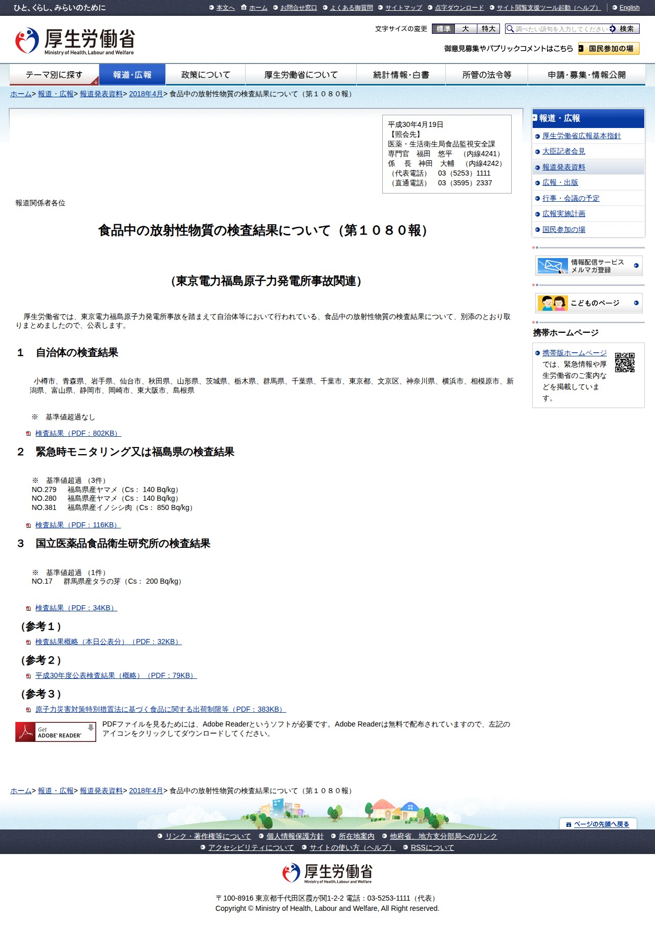 食品中の放射性物質の検査結果について(第1080報) |報道発表資料|厚生労働省