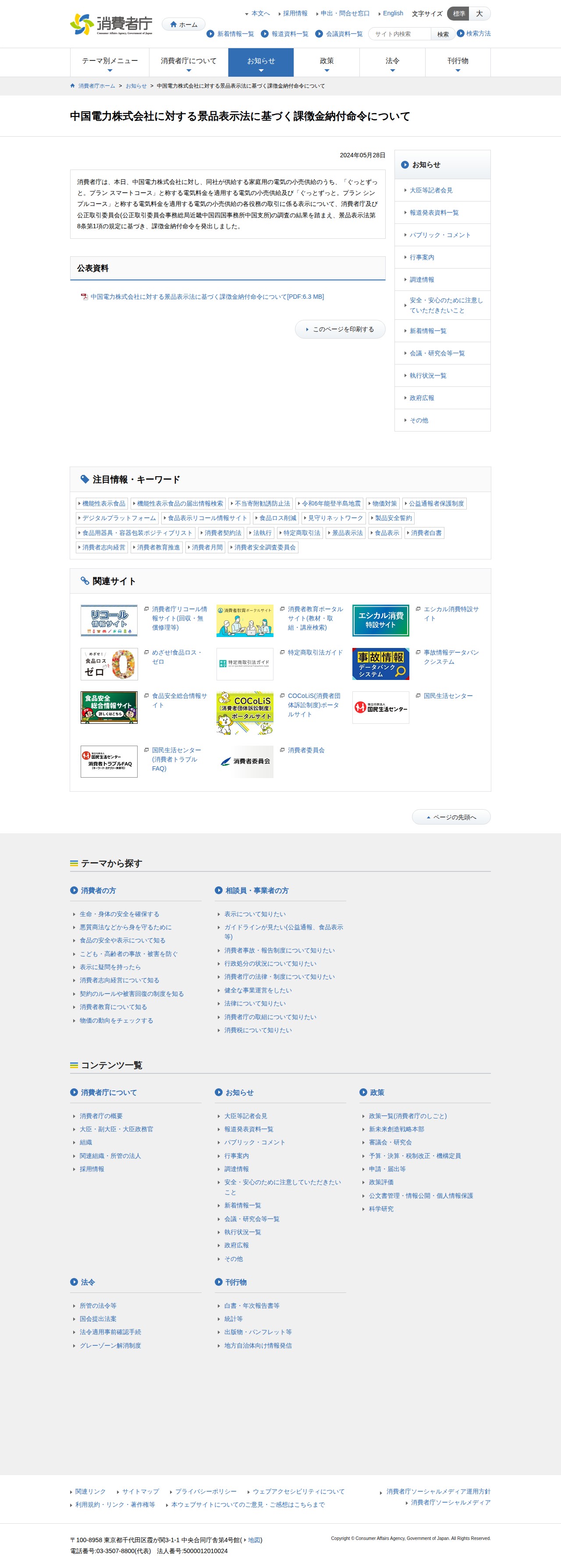 中国電力株式会社に対する景品表示法に基づく課徴金納付命令について | 消費者庁 - 保存されたスクリーンショット