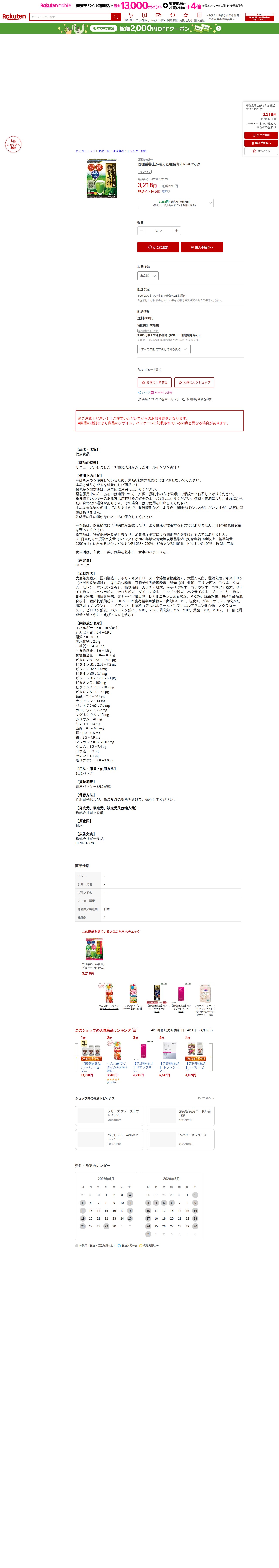 このページは、楽天市場で販売されている「管理栄養士が考えた極撰青汁R 60パック」の商品紹介ページです。価格は3,218円(送料660円)で、95種の成分を含むオールインワン青汁です。大麦若葉粉末を主成分とし、野菜粉末や乳酸菌、DHA・EPA、ビタミンなど多数の栄養素が配合されています。1歳未満の乳児への提供は禁止で、妊娠中や服用中の薬がある場合は医師への相談が必要です。天産物使用のため色・風味にばらつきがある場合があります。