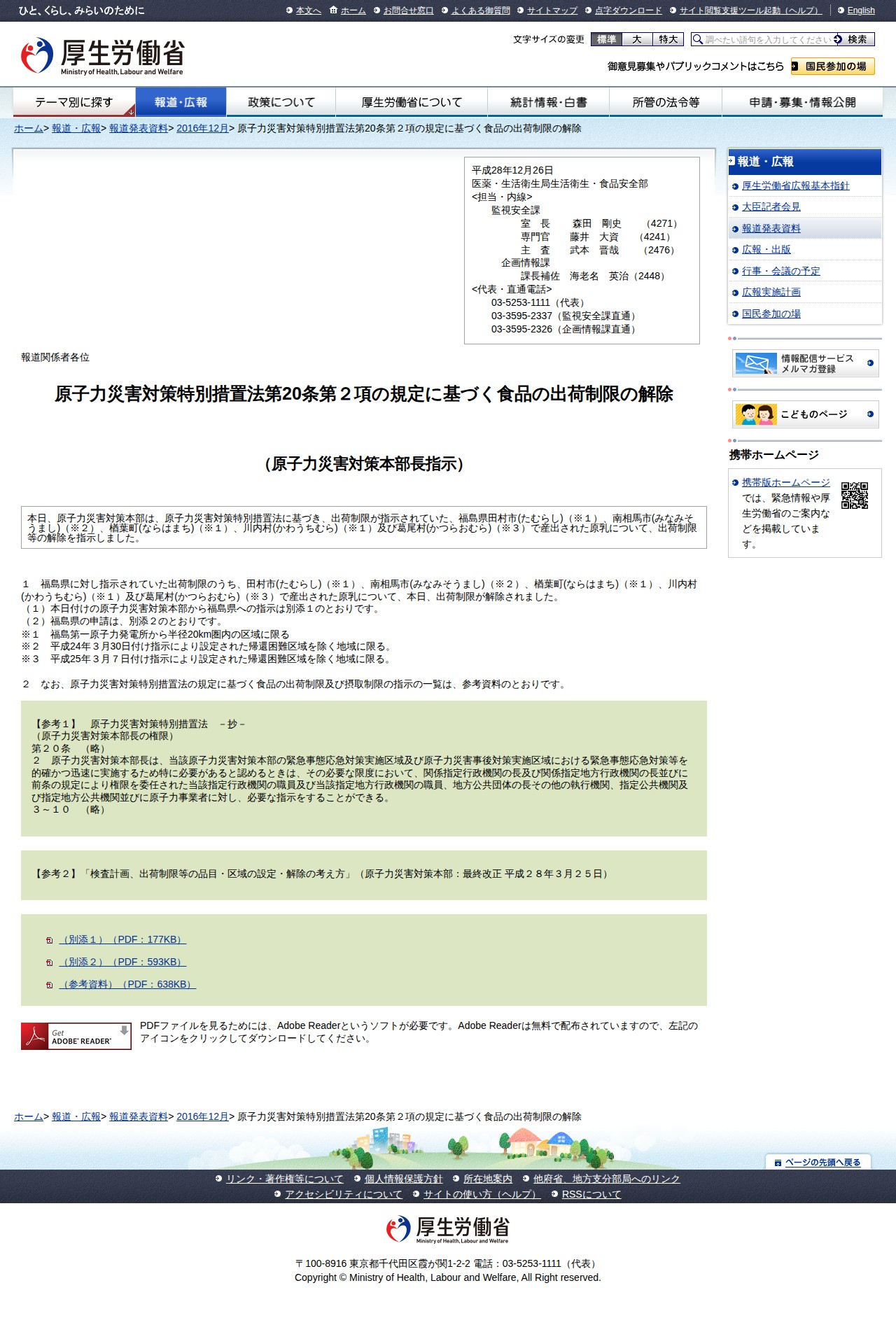 原子力災害対策特別措置法第20条第2項の規定に基づく食品の出荷制限の解除 |報道発表資料|厚生労働省