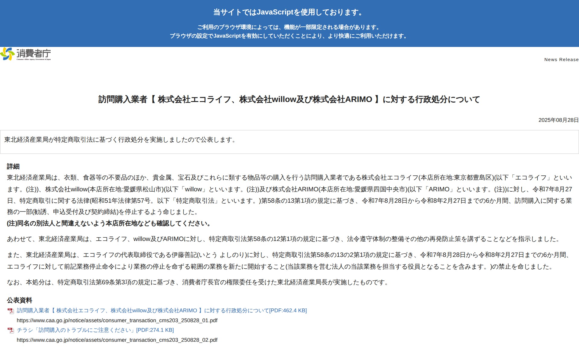 訪問購入業者【 株式会社エコライフ、株式会社willow及び株式会社ARIMO 】に対する行政処分について | 消費者庁