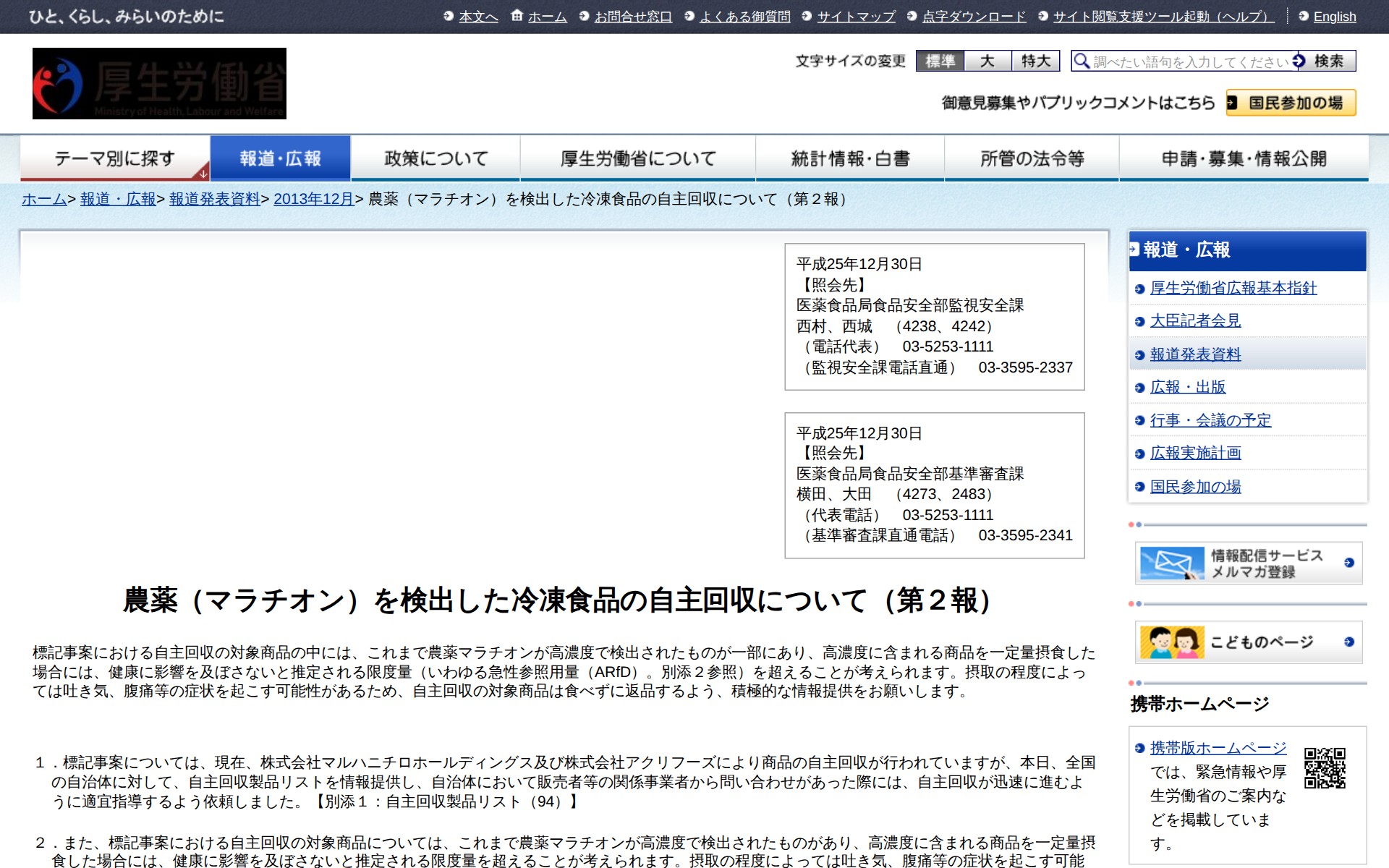 農薬(マラチオン)を検出した冷凍食品の自主回収について(第2報) |報道発表資料|厚生労働省