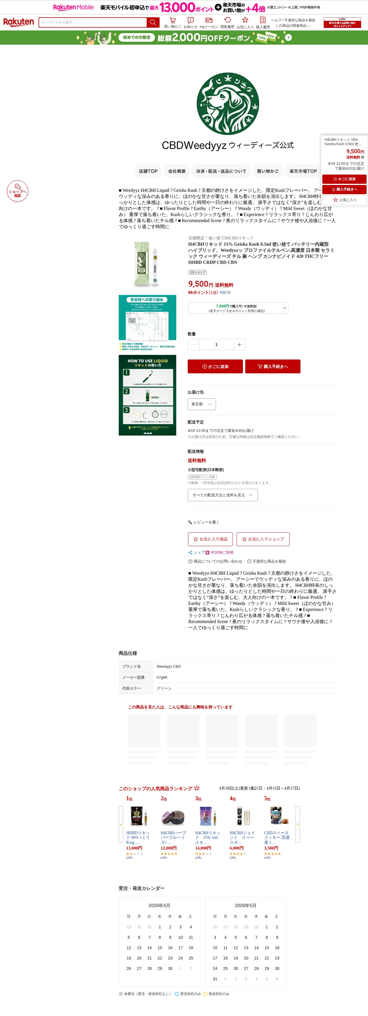 【楽天市場】H4CBHリキッド 15% Geisha Kush 0.5ml 使い捨て バッテリー内蔵型 ハイブリッド、Weedyyzッ プロファイルテルペン,高濃度 日本製 セラミック ウィーディーズ チル 麻 ヘンプ カンナビノイド 420 THCフリー HHBD CRDP CBD CBN:CBDWeedyyz ウィーディーズ公式 - 保存されたスクリーンショット