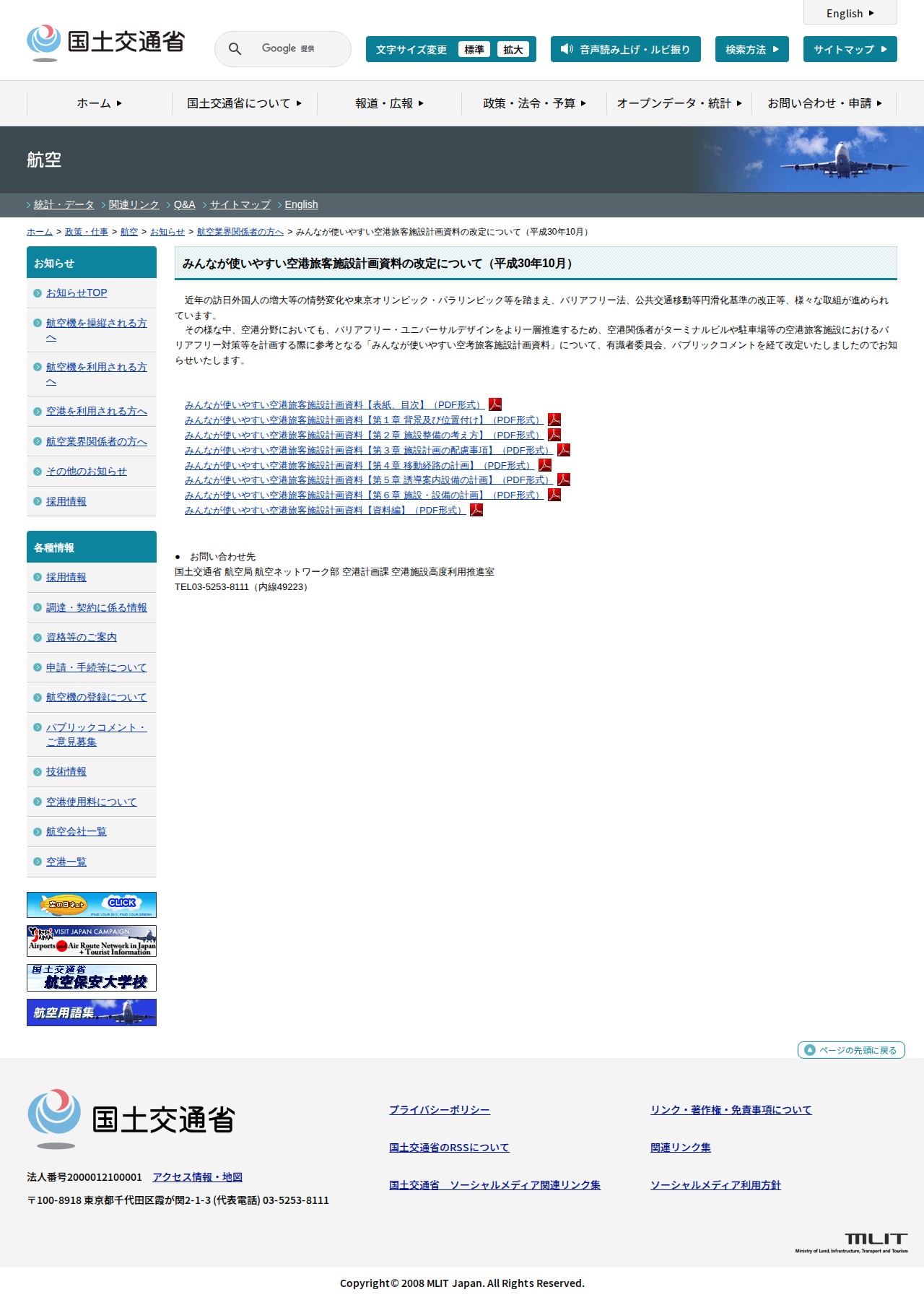 このページは、国土交通省が2018年10月に改定した「みんなが使いやすい空港旅客施設計画資料」についての公表ページである。訪日外国人の増加と東京オリンピック・パラリンピックを踏まえ、バリアフリー法や公共交通移動等円滑化基準の改正に対応するため、空港分野でバリアフリー・ユニバーサルデザインを推進する資料を改定した。有識者委員会とパブリックコメントを経た改定版は、ターミナルビルや駐車場などの空港旅客施設計画時の参考資料として、背景・施設整備方法・配慮事項・移動経路・誘導案内設備・施設設備計画などを内容とするPDF形式で公開されている。