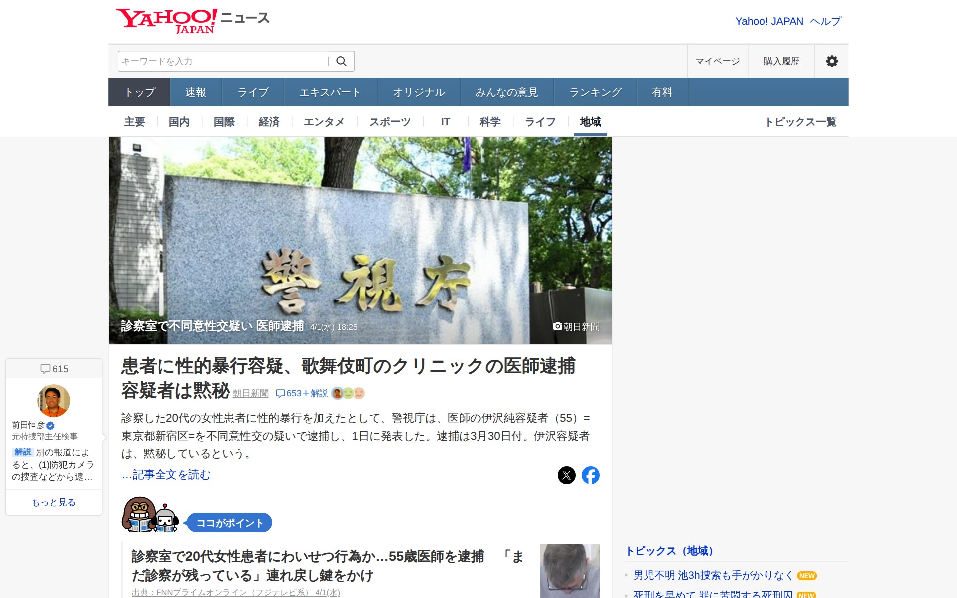 このページは、東京・歌舞伎町のクリニックの医師・伊沢純容疑者(55)が、診察した20代女性患者に性的暴行を加えたとして、警視庁に不同意性交の疑いで逮捕されたことを報じるニュース記事です。3月30日付での逮捕で、容疑者は黙秘しているとのこと。防犯カメラの捜査などから逮捕に至り、警視庁は他の被害者の有無も調べています。コメント欄では、同容疑者の過去の犯罪歴(医師法違反、ストーカー、わいせつ行為など)が指摘されています。