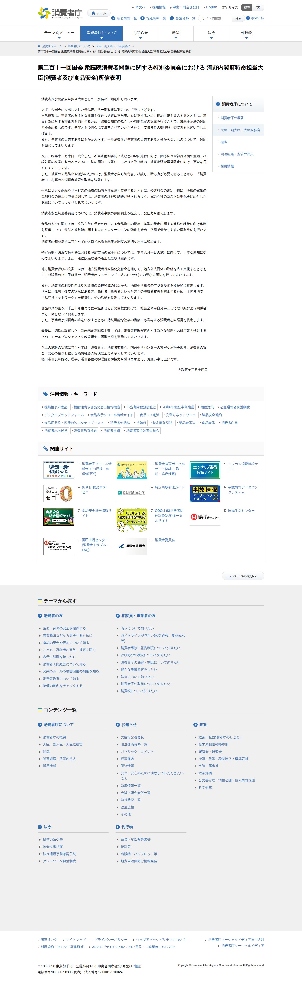第二百十一回国会 衆議院消費者問題に関する特別委員会における 河野内閣府特命担当大臣(消費者及び食品安全)所信表明 | 消費者庁