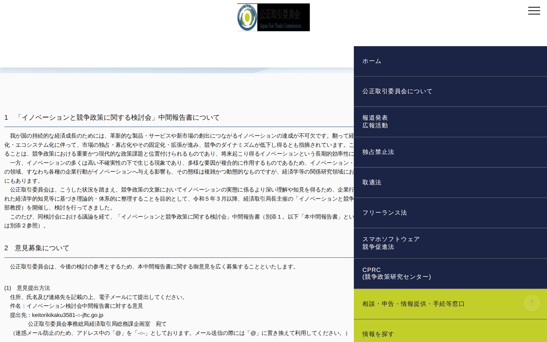 このページは、公正取引委員会が令和5年6月30日に公表した「イノベーションと競争政策に関する検討会」中間報告書についての発表です。日本の経済成長にはイノベーションが不可欠である一方、デジタル経済の進展により市場の独占・寡占化が進む懸念があります。公正取引委員会は企業行動がイノベーションに与える影響を理論的・体系的に整理するため、令和5年3月から検討会を開催してきました。中間報告書が取りまとめられたため公表され、同報告書に関する意見を広く募集しています。