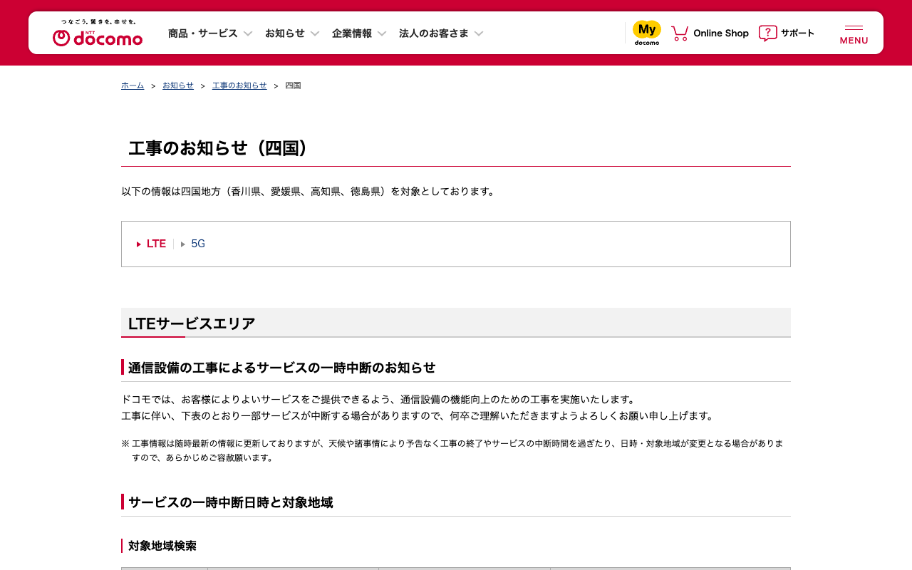 工事のお知らせ(四国) : LTE | お知らせ | NTTドコモ