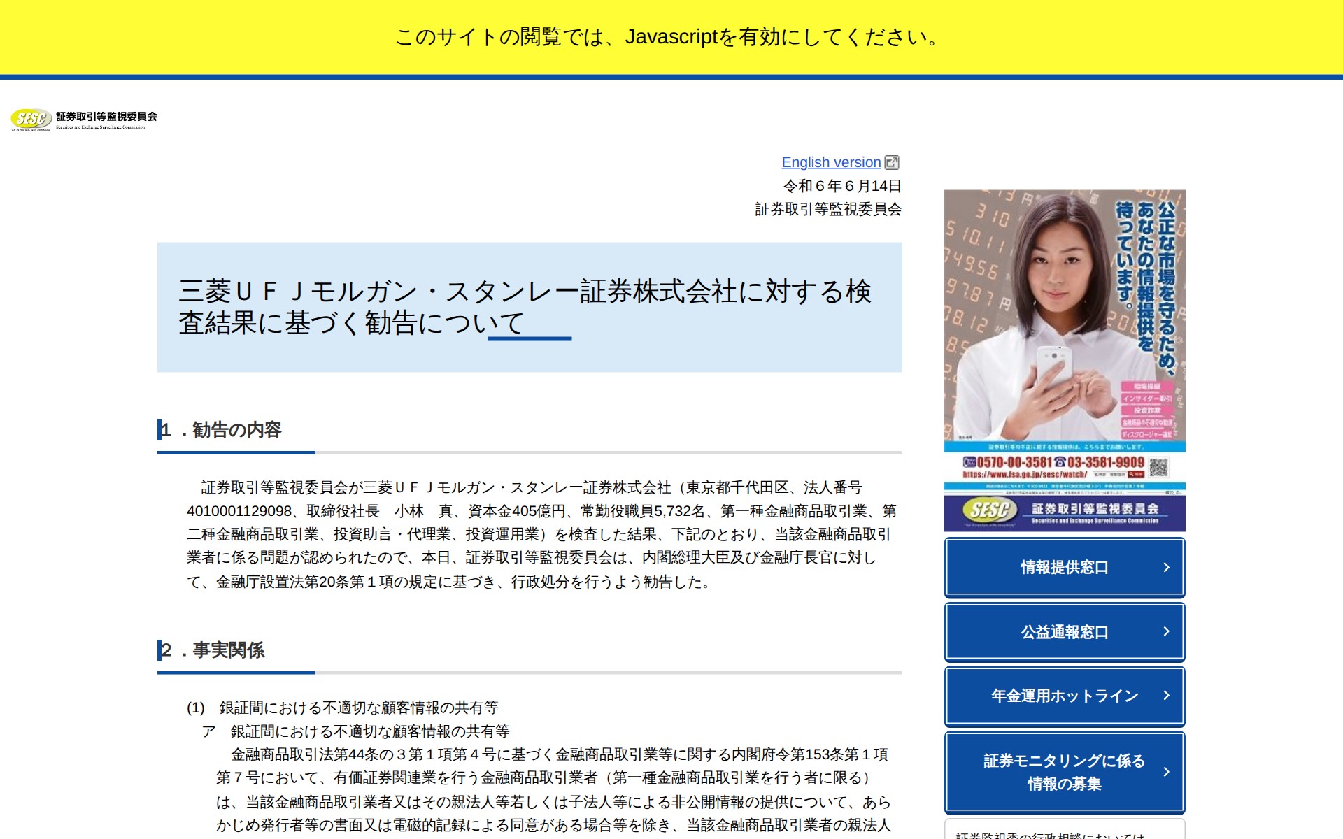 三菱UFJモルガン・スタンレー証券株式会社に対する検査結果に基づく勧告について - 保存されたスクリーンショット