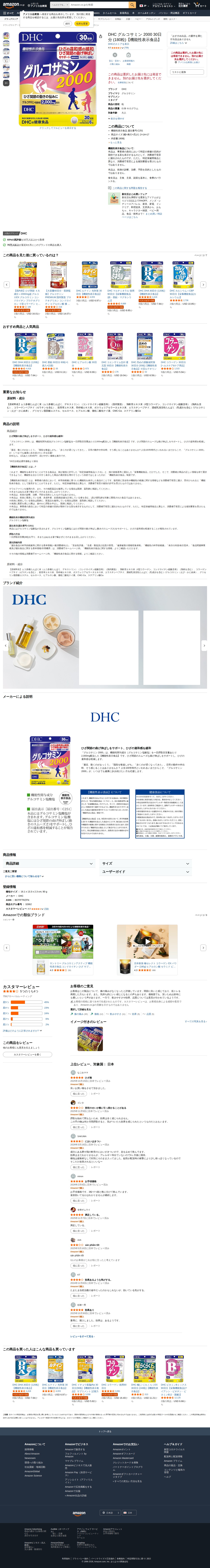 このページはAmazonで販売されているDHC グルコサミン2000 ひざサポート 30日分の商品ページです。180粒入り、30日分の機能性表示食品で、グルコサミンを主成分とするサプリメントです。ブランドはDHCで、5つ星中4.0の評価を759件のレビューから獲得しています。エビ、カニ、ゼラチン、乳、鶏肉がアレルギー情報として表示されています。本品は消費者庁に届出された機能性表示食品ですが、個別審査を受けたものではなく、疾病の診断・治療・予防を目的としたものではありません。