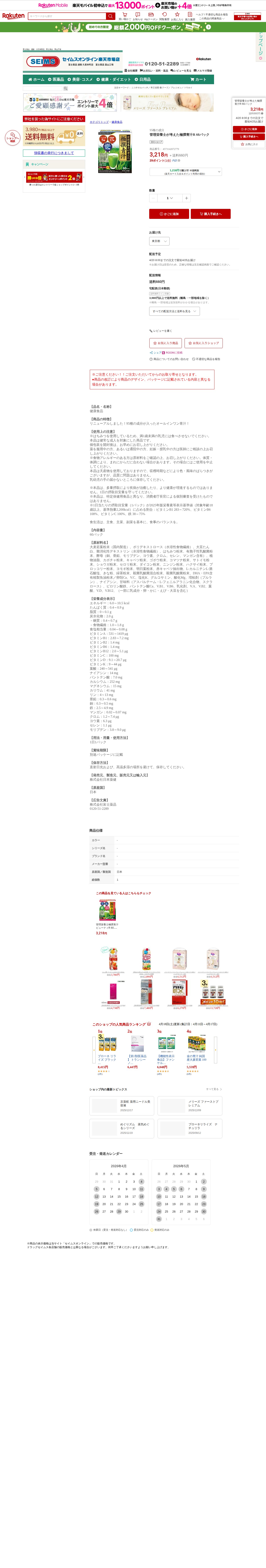 このページは、楽天市場で販売されている「管理栄養士が考えた極撰青汁R 60パック」の商品紹介ページです。価格は3,218円(送料660円)で、95種の成分を含むオールインワン青汁です。大麦若葉を主成分とし、野菜粉末、乳酸菌、DHA・EPA、ビタミン類など多くの栄養素が配合されています。1歳未満の乳児や妊娠授乳中の方、薬服用中の方は医師に相談が必要です。天産物使用のため色・風味のばらつきがある場合があります。