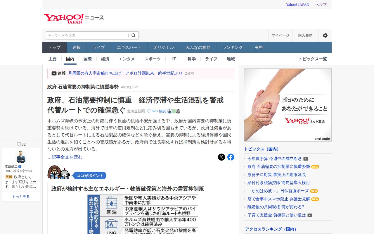 政府 石油需要の抑制策に慎重姿勢 - Yahoo!ニュース - 保存されたスクリーンショット