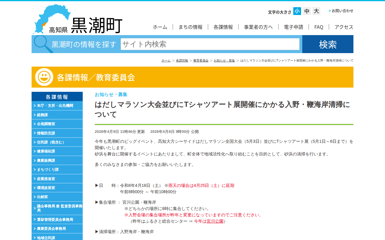 はだしマラソン大会並びにTシャツアート展開催にかかる入野・鞭海岸清掃について│黒潮町公式ホームページ - 保存されたスクリーンショット