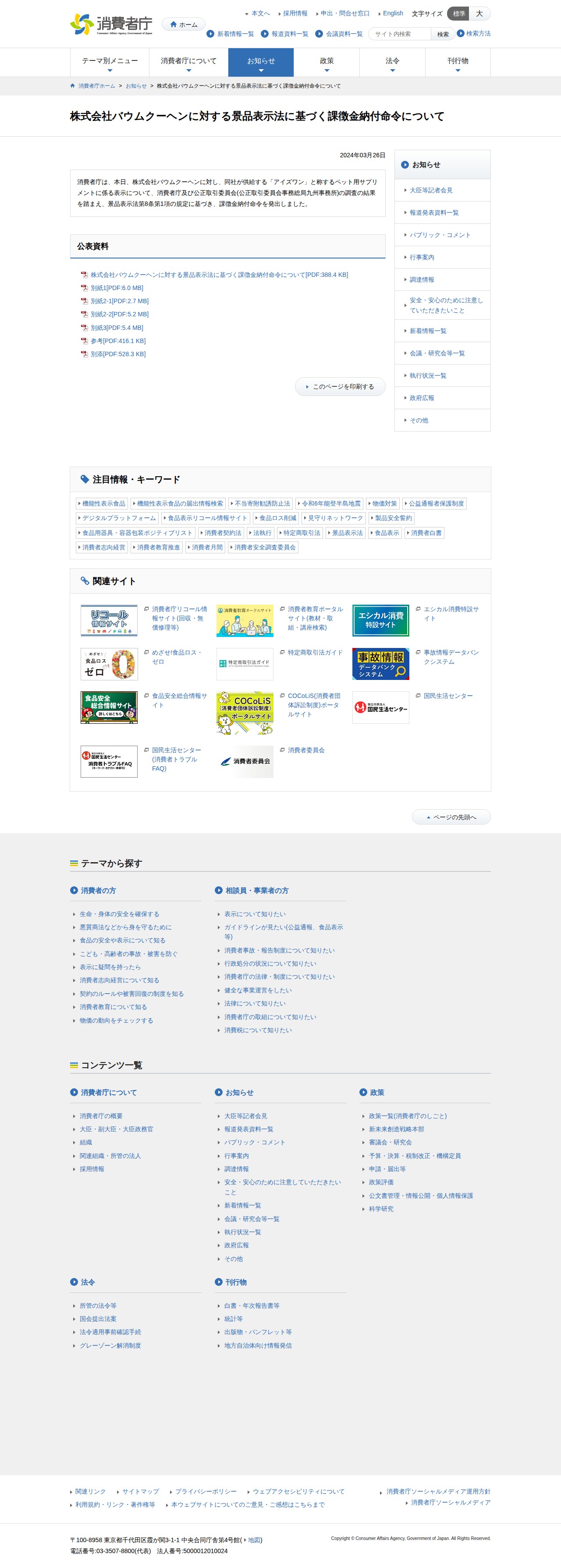 このページは、消費者庁が2024年3月26日に株式会社バウムクーヘンに対して発出した景品表示法に基づく課徴金納付命令について掲載しています。同社が供給するペット用サプリメント「アイズワン」の表示について、消費者庁と公正取引委員会の調査結果に基づき、景品表示法第8条第1項の規定により課徴金納付命令が発出されました。詳細な情報は公開されたPDF資料で確認できます。