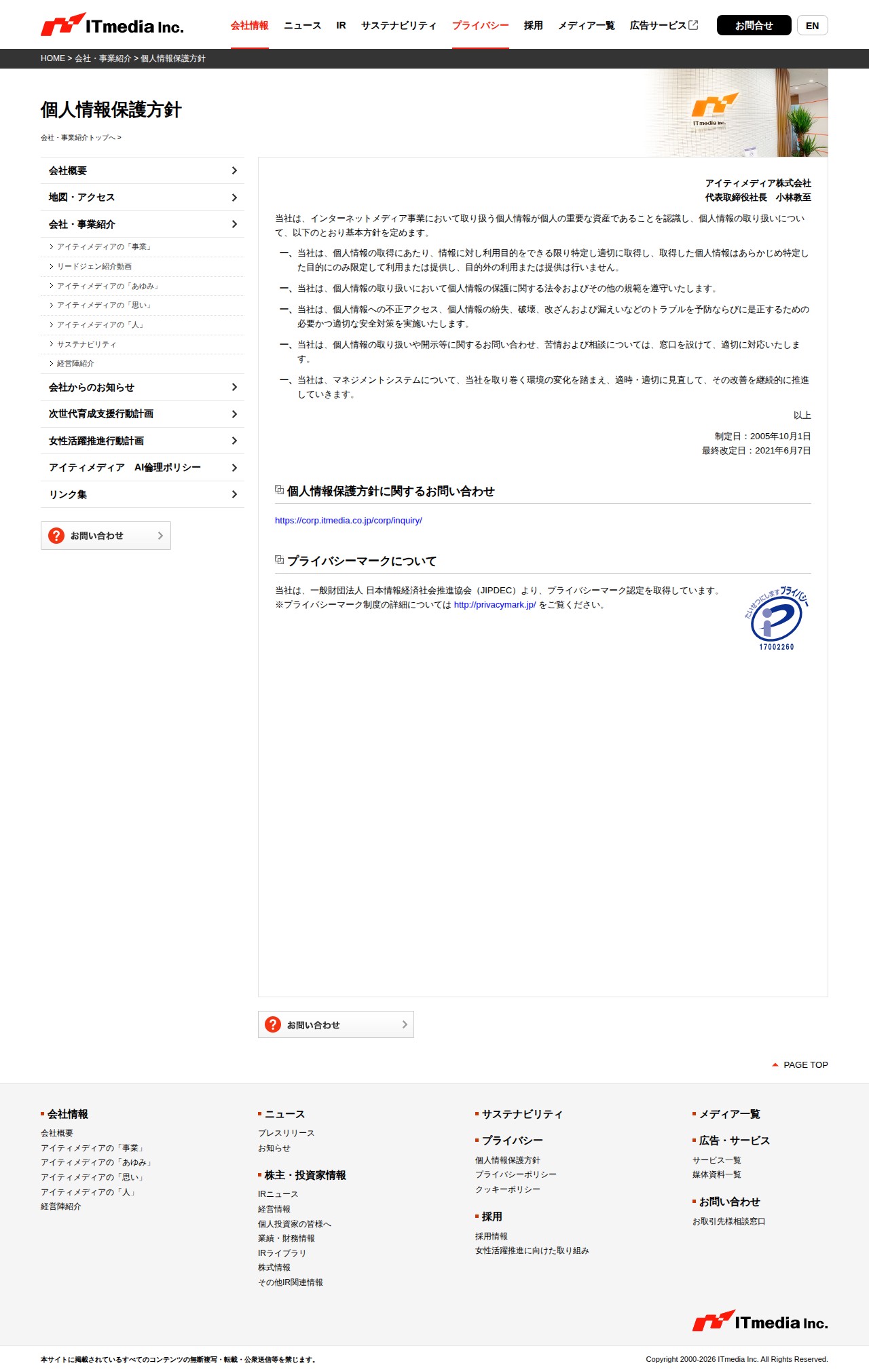 このページはアイティメディア株式会社の個人情報保護方針を掲載したものです。同社はインターネットメディア事業で扱う個人情報を重要な資産と認識し、以下の基本方針を定めています:利用目的を特定して適切に個人情報を取得し、目的限定での利用・提供を徹底すること、個人情報保護法など関連法令を遵守すること、不正アクセスや漏えい防止のための安全対策を実施すること、相談や苦情に対応する窓口を設置すること、そして環境変化に応じてマネジメントシステムを継続的に改善することです。同社はJIPDECよりプライバシーマーク認定を取得しており、2005年10月1日制定、2021年6月7日最終改定されています。