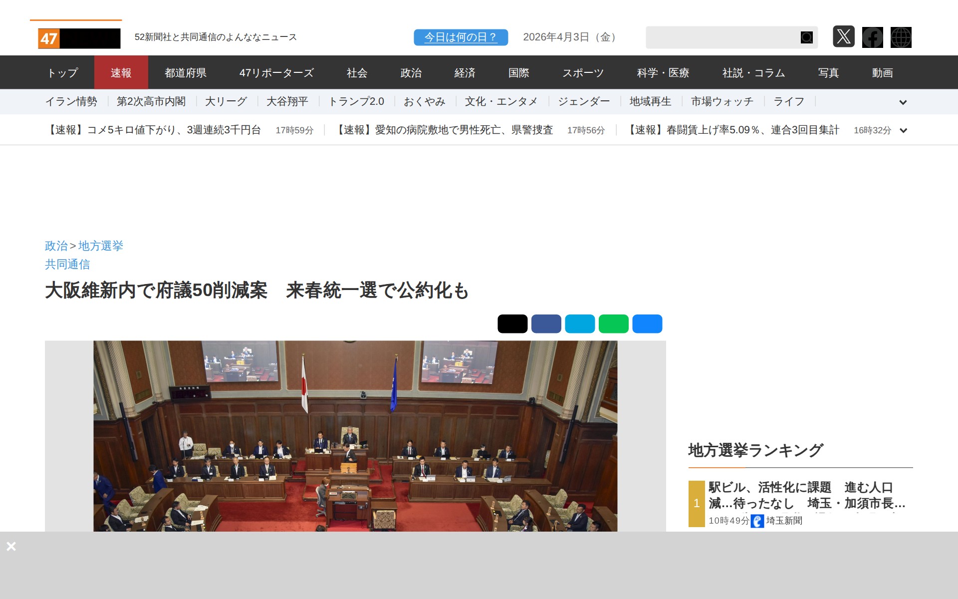 大阪維新内で府議50削減案 来春統一選で公約化も|47NEWS(よんななニュース)