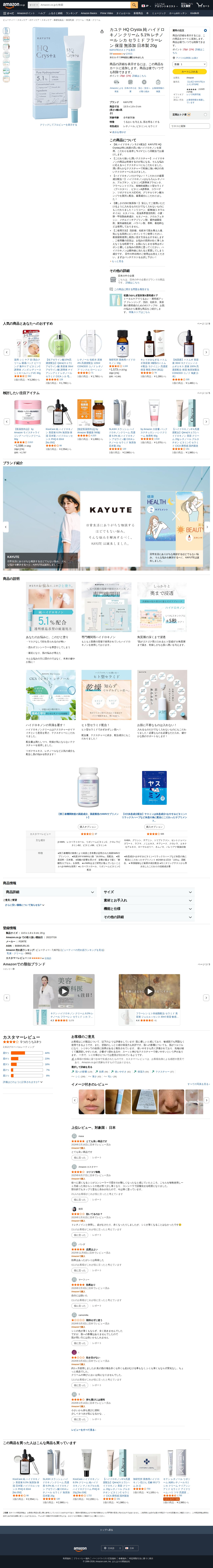 このページはAmazonで販売されているKAYUTE HQ Crystaという美容クリーム製品の商品ページです。純ハイドロキノン5.1%を高配合した日本製のクリーム(20g)で、レチノール、シカ、セラミド、フラーレンなどの保湿成分を含む無添加製品です。乾燥肌向けで、ハイドロキノン製品の乾燥問題を解決するため、潤い滑らかなテクスチャーを実現しています。肌を明るくし、うるおいを与えることが特徴で、3.8つ星の評価を受け、月間200点以上購入されている人気製品です。