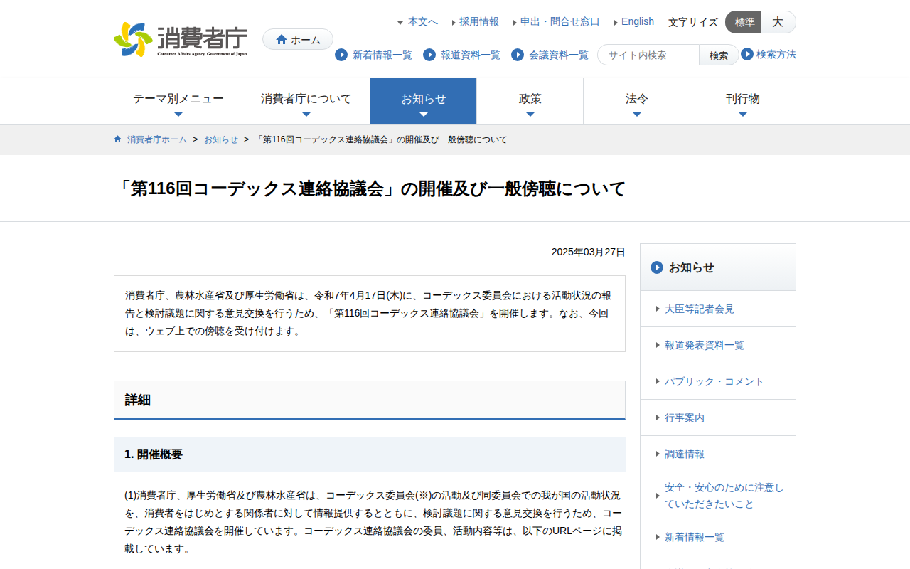 「第116回コーデックス連絡協議会」の開催及び一般傍聴について | 消費者庁