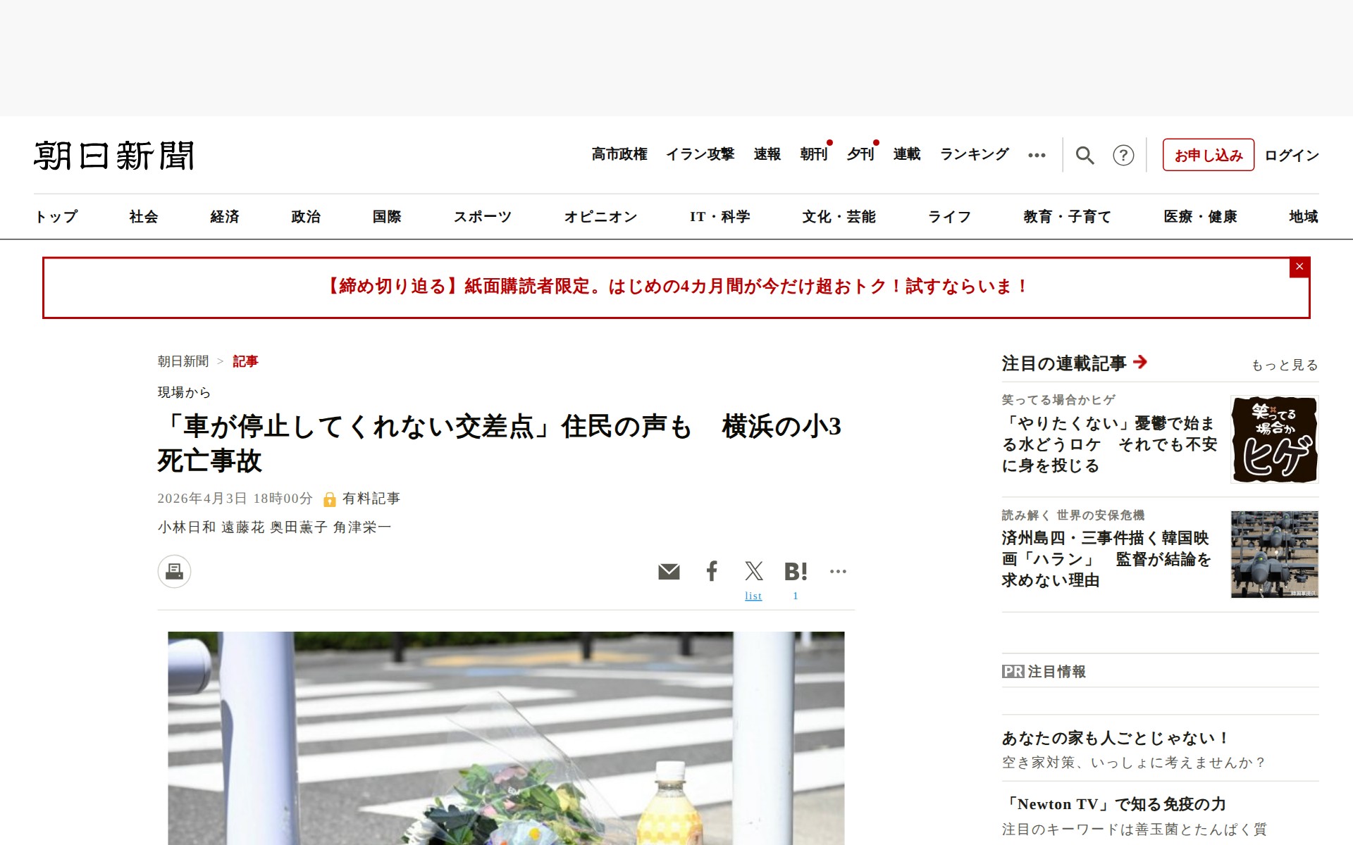 「車が停止してくれない交差点」住民の声も 横浜の小3死亡事故 [神奈川県]:朝日新聞 - 保存されたスクリーンショット