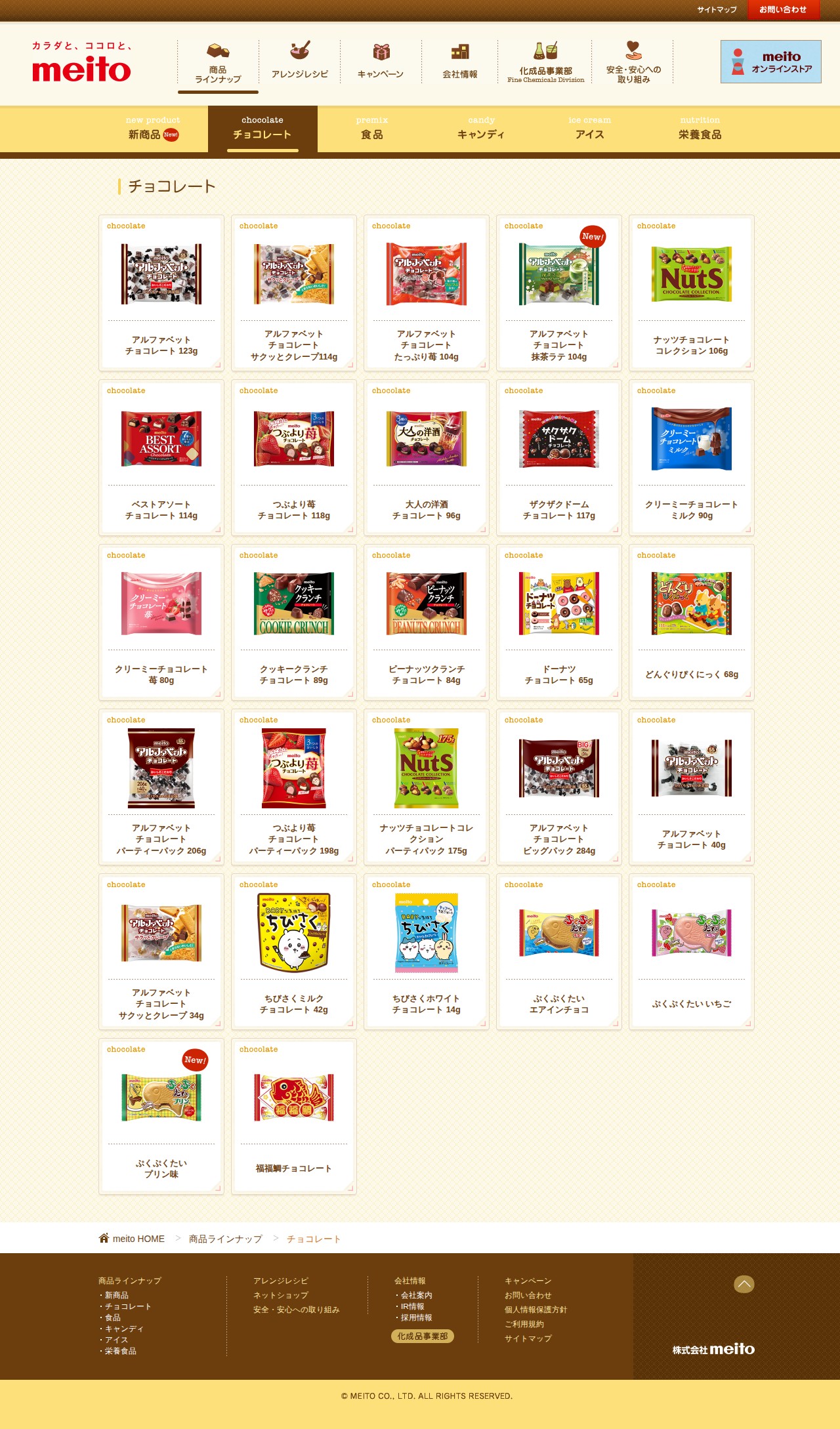 このページは、株式会社meitoのチョコレート商品ラインナップを紹介しています。アルファベットチョコレートやサクッとクレープ、たっぷり苺など、様々なフレーバーの商品が展開されています。パーティーパックやビッグパック、小型の個別包装品など、複数のサイズ展開があります。ナッツチョコレートコレクションやクリーミーチョコレート、ぷくぷくたいなど、多様な商品ラインが揃っています。