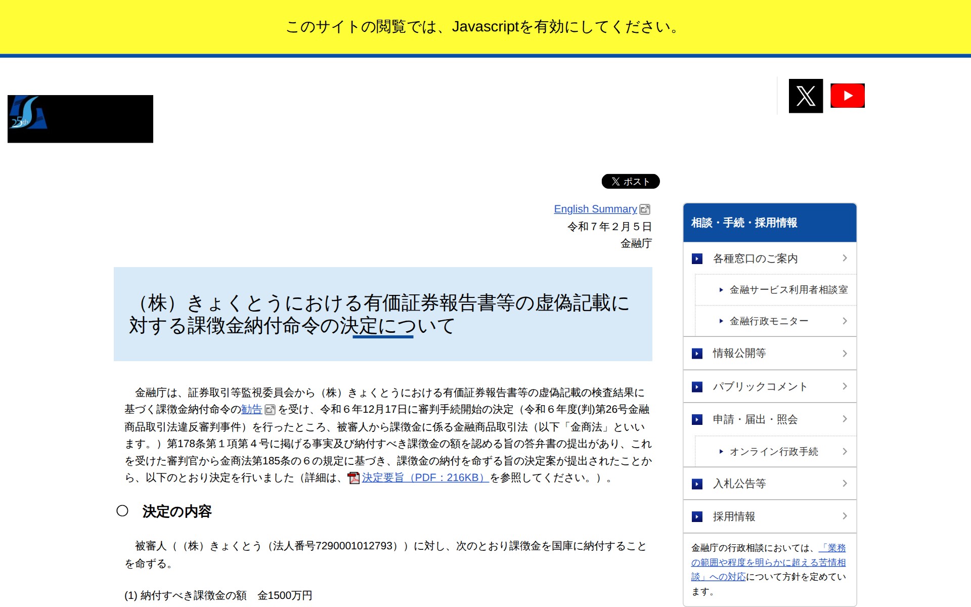 このページは、金融庁が(株)きょくとうに対して有価証券報告書等の虚偽記載について課徴金納付命令を決定したことを発表しています。証券取引等監視委員会の検査結果に基づき、金融商品取引法違反の審判手続が開始され、被審人が課徴金納付を認める答弁書を提出しました。金融庁は2025年2月5日付で、(株)きょくとうに対し1500万円の課徴金を国庫に納付することを命じました。納付期限は2025年4月7日です。